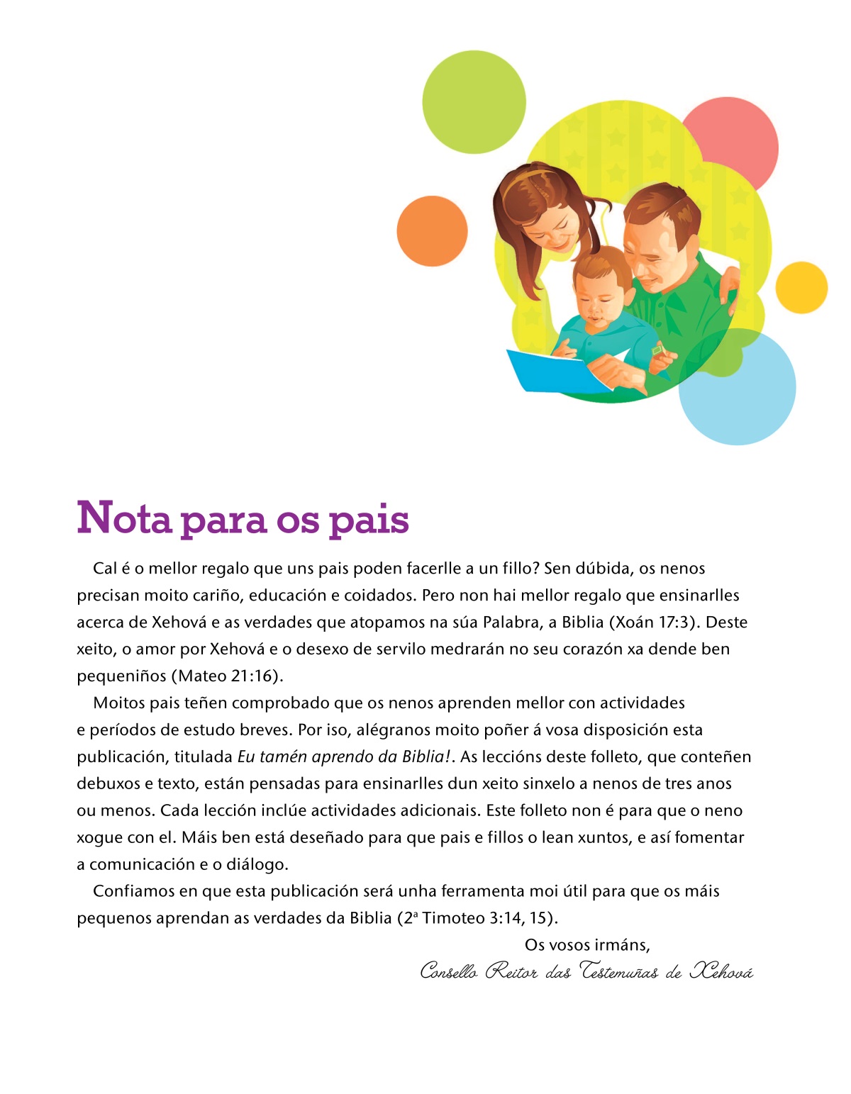 Moitos pais teñen comprobado que os nenos aprenden mellor con actividades e períodos de estudo breves. Por iso, alégranos moito poñer á vosa disposición esta publicación, titulada Eu tamén aprendo da Biblia!. As leccións deste folleto, que conteñen debuxos e texto, están pensadas para ensinarlles dun xeito sinxelo a nenos de tres anos ou menos. Cada lección inclúe actividades adicionais. Este folleto non é para que o neno xogue con el. Máis ben está deseñado para que pais e fillos o lean xuntos, e así fomentar a comunicación e o diálogo.