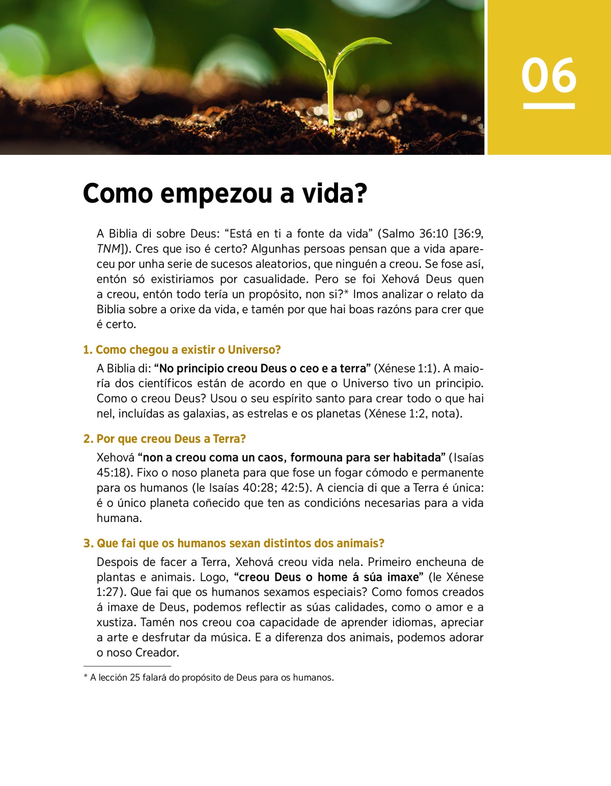 a A lección 25 falará do propósito de Deus para os humanos.