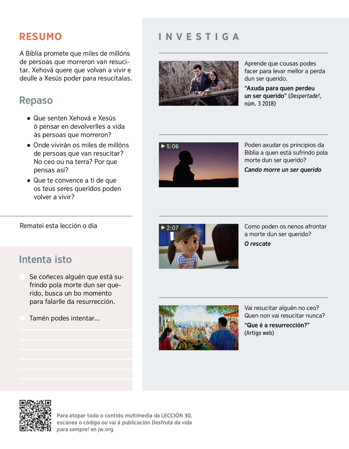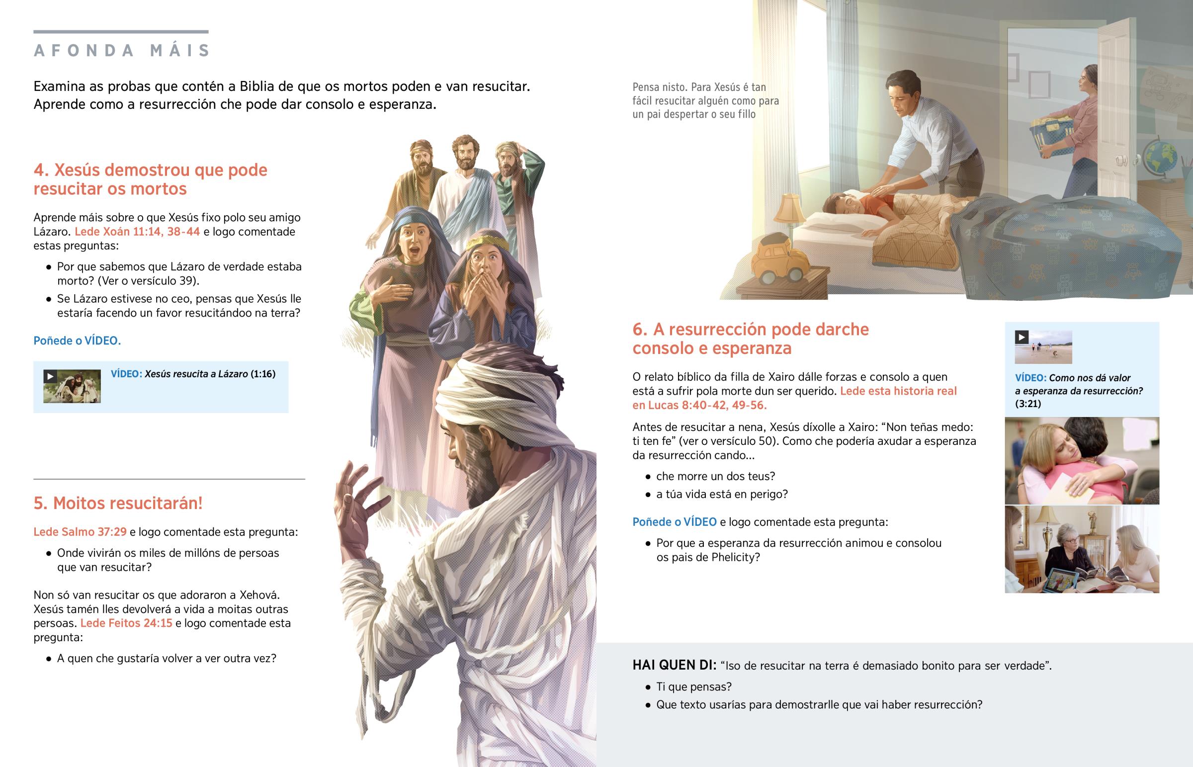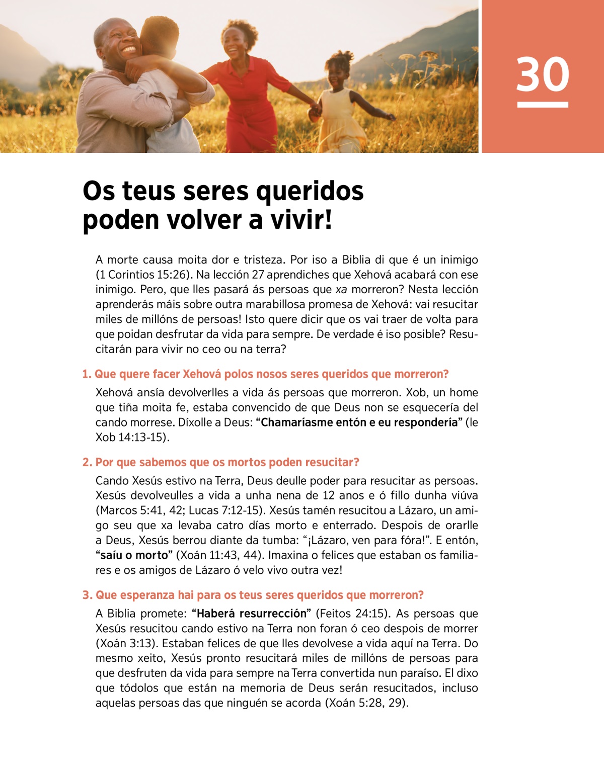 A morte causa moita dor e tristeza. Por iso a Biblia di que é un inimigo (1 Corintios 15:26). Na lección 27 aprendiches que Xehová acabará con ese inimigo. Pero, que lles pasará ás persoas que xa morreron? Nesta lección aprenderás máis sobre outra marabillosa promesa de Xehová: vai resucitar miles de millóns de persoas! Isto quere dicir que os vai traer de volta para que poidan desfrutar da vida para sempre. De verdade é iso posible? Resucitarán para vivir no ceo ou na terra?