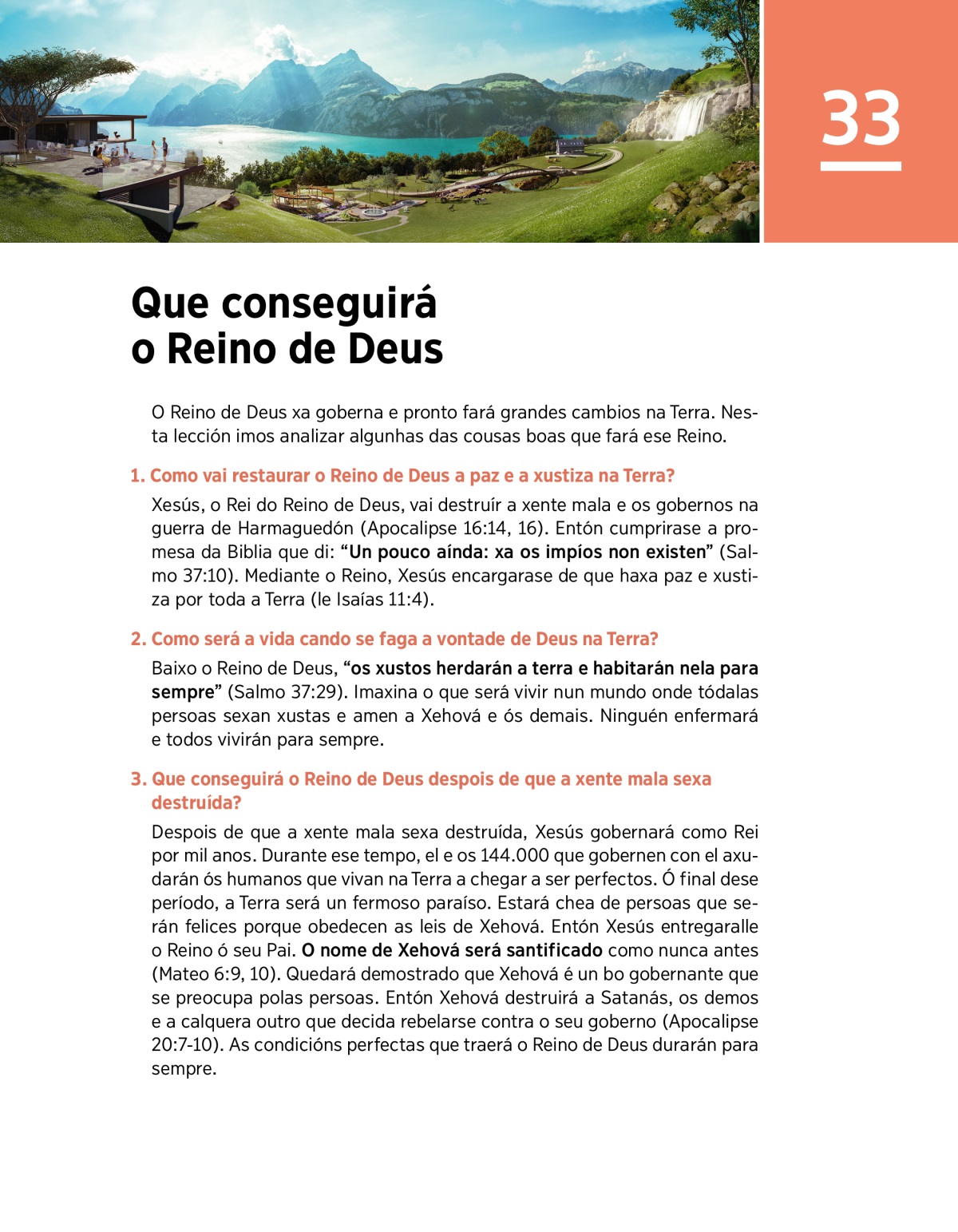 O Reino de Deus xa goberna e pronto fará grandes cambios na Terra. Nesta lección imos analizar algunhas das cousas boas que fará ese Reino.