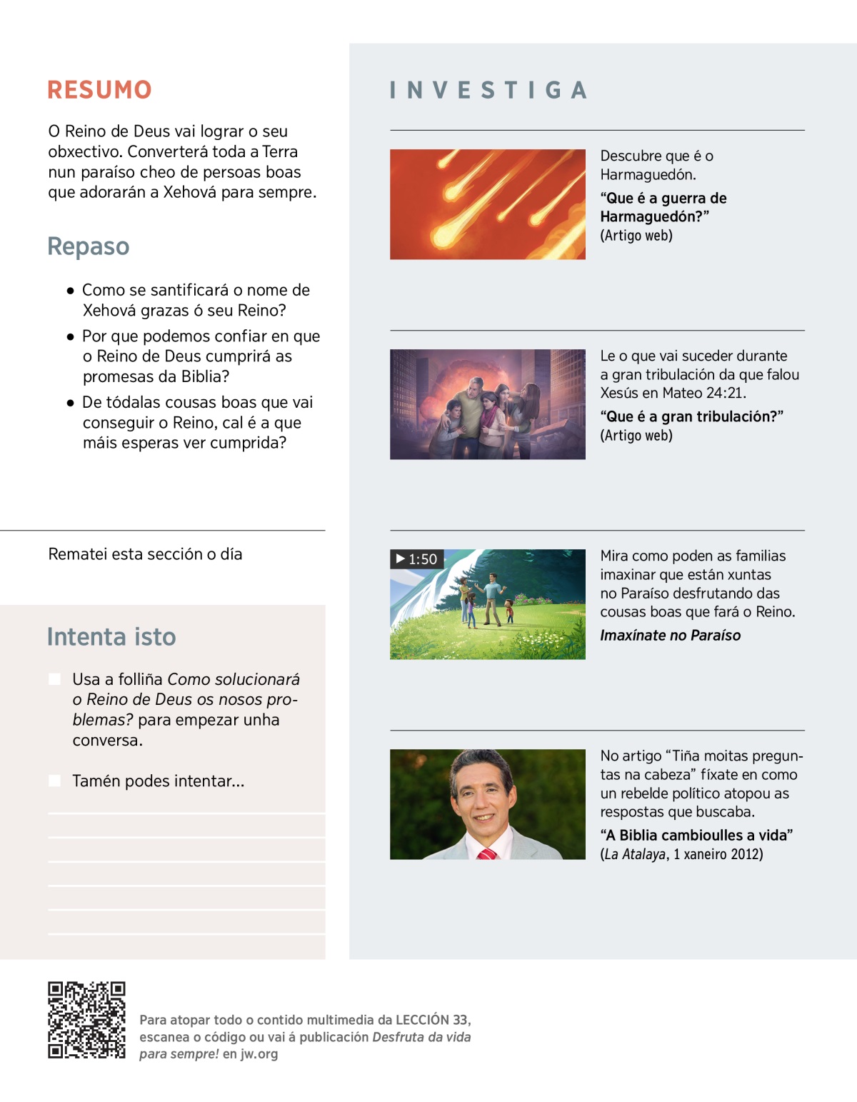 O Reino vai cumprir o que Xehová tiña pensado dende o principio para os humanos. Vivirán para sempre na Terra feita un paraíso. Poñede o VÍDEO para ver o que está a facer Xehová mediante Xesús para cumprir o seu propósito.