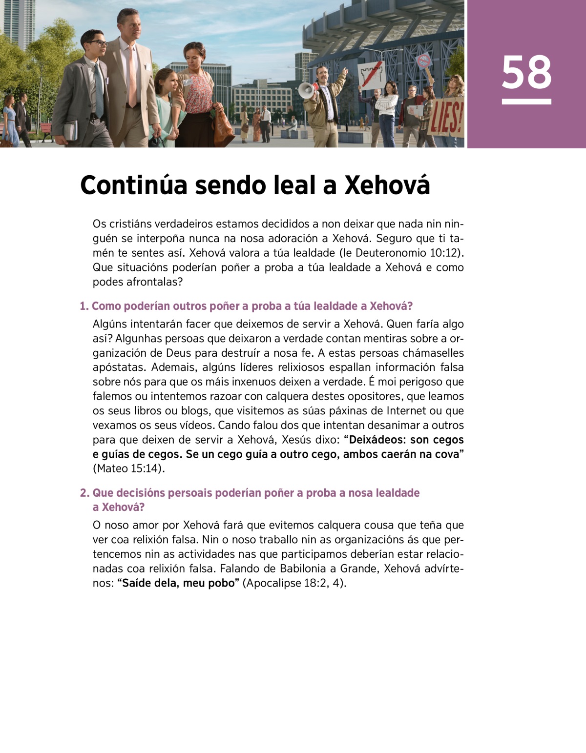 Os cristiáns verdadeiros estamos decididos a non deixar que nada nin ninguén se interpoña nunca na nosa adoración a Xehová. Seguro que ti tamén te sentes así. Xehová valora a túa lealdade (le Deuteronomio 10:12). Que situacións poderían poñer a proba a túa lealdade a Xehová e como podes afrontalas?