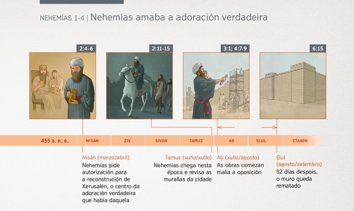 2:4-6 Nehemías pide autorización para a reconstrución de Xerusalén, o centro da adoración verdadeira que había daquela
