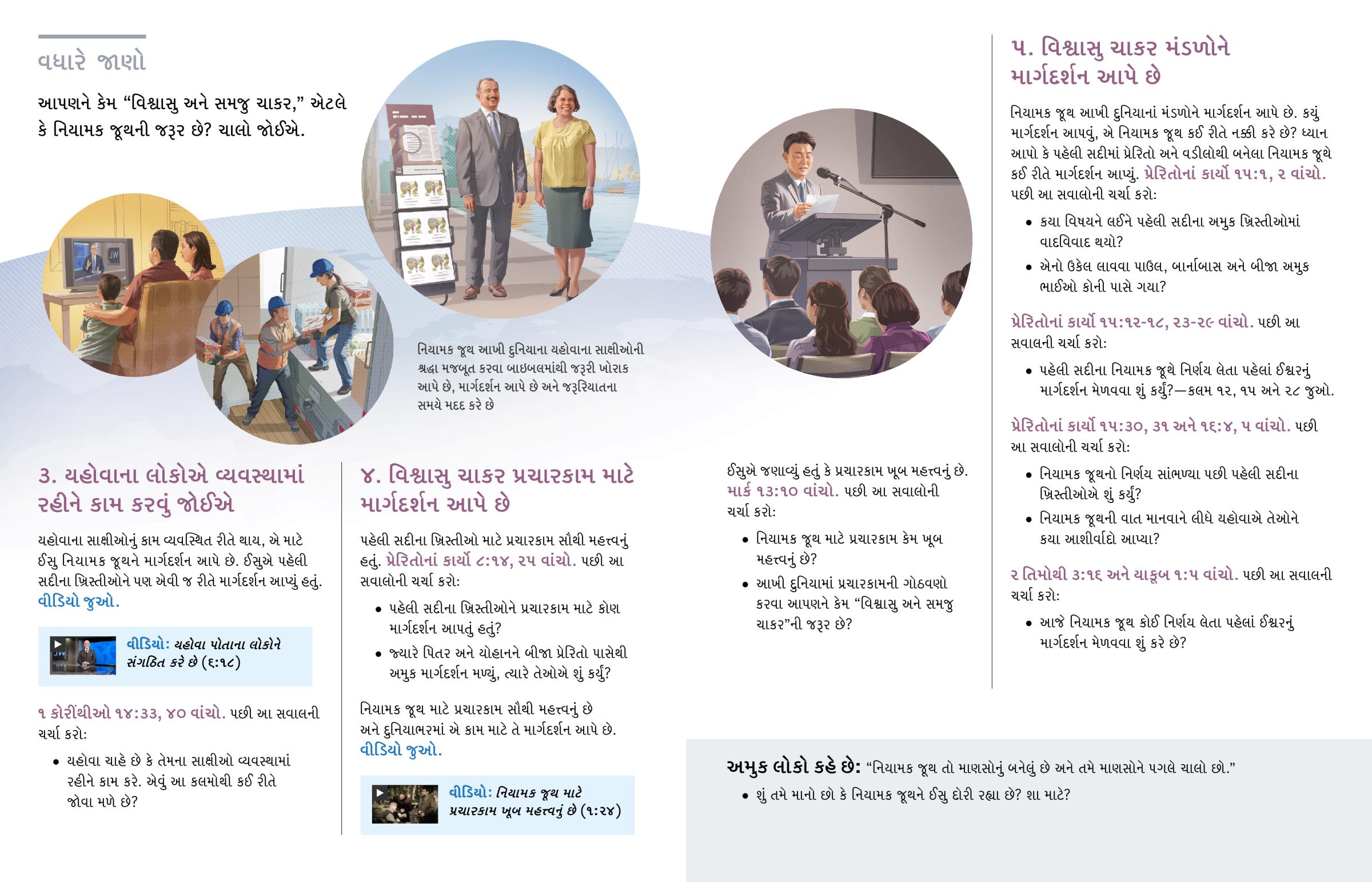 નિયામક જૂથ આખી દુનિયાનાં મંડળોને માર્ગદર્શન આપે છે. કયું માર્ગદર્શન આપવું, એ નિયામક જૂથ કઈ રીતે નક્કી કરે છે? ધ્યાન આપો કે પહેલી સદીમાં પ્રેરિતો અને વડીલોથી બનેલા નિયામક જૂથે કઈ રીતે માર્ગદર્શન આપ્યું. પ્રેરિતોનાં કાર્યો ૧૫:૧, ૨ વાંચો. પછી આ સવાલોની ચર્ચા કરો: