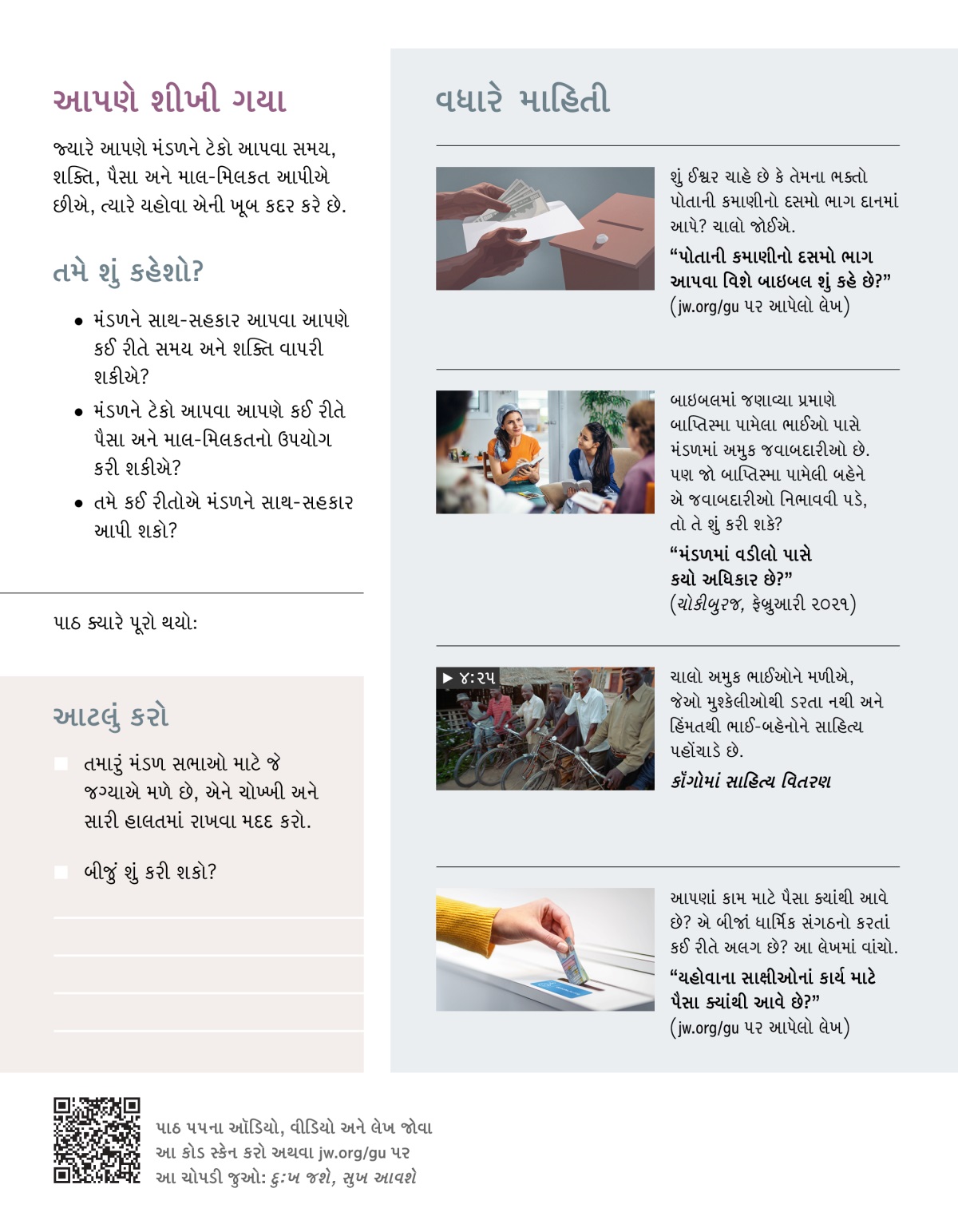 “યહોવાના સાક્ષીઓનાં કાર્ય માટે પૈસા ક્યાંથી આવે છે?” (jw.org/gu પર આપેલો લેખ)
