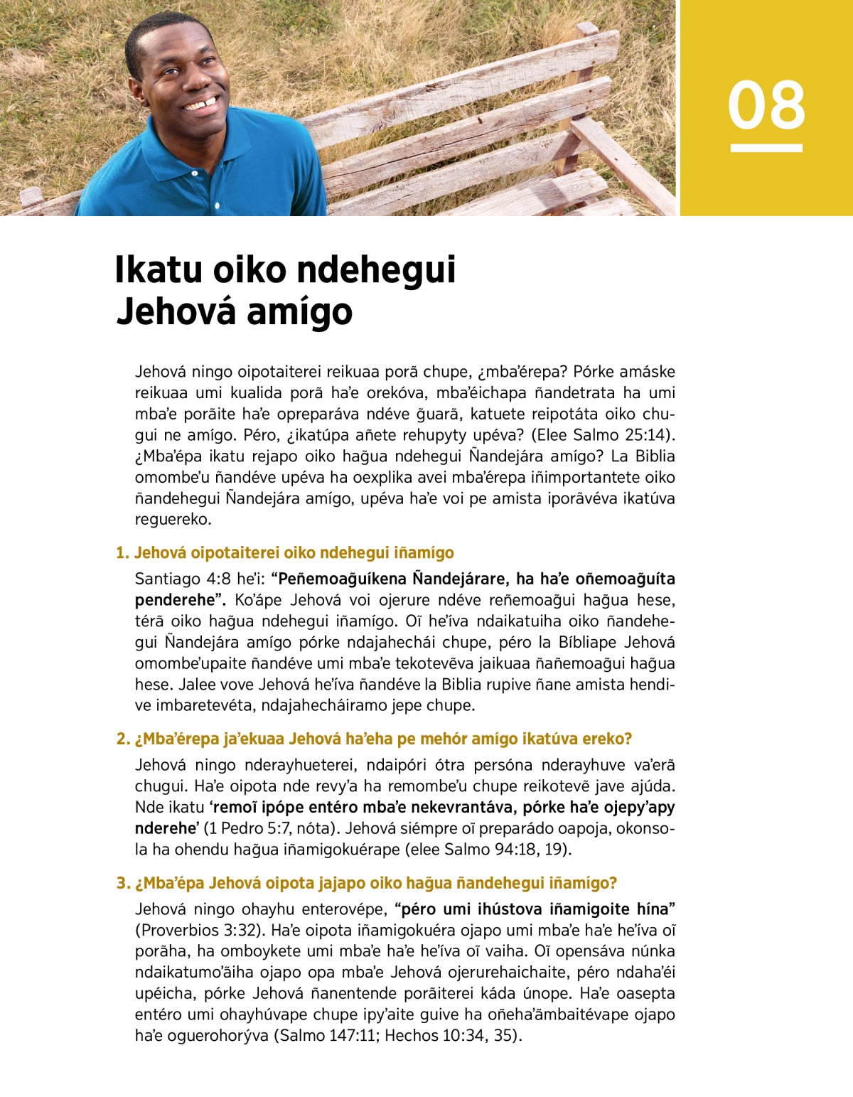 Jehová ningo oipotaiterei reikuaa porã chupe, ¿mbaʼérepa? Pórke amáske reikuaa umi kualida porã haʼe orekóva, mbaʼéichapa ñandetrata ha umi mbaʼe porãite haʼe opreparáva ndéve g̃uarã, katuete reipotáta oiko chugui ne amígo. Péro, ¿ikatúpa añete rehupyty upéva? (Elee Salmo 25:14). ¿Mbaʼépa ikatu rejapo oiko hag̃ua ndehegui Ñandejára amígo? La Biblia omombeʼu ñandéve upéva ha oexplika avei mbaʼérepa iñimportantete oiko ñandehegui Ñandejára amígo, upéva haʼe voi pe amista iporãvéva ikatúva reguereko.