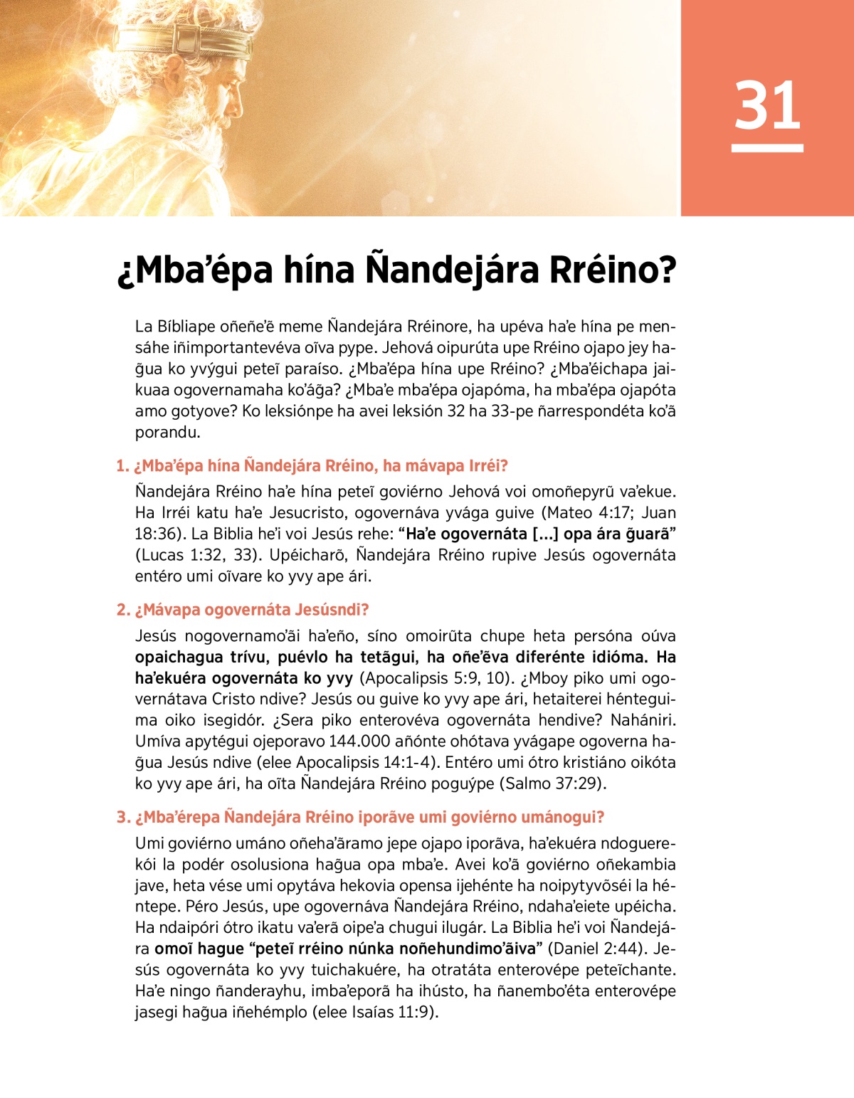 La Bíbliape oñeñeʼẽ meme Ñandejára Rréinore, ha upéva haʼe hína pe mensáhe iñimportantevéva oĩva pype. Jehová oipurúta upe Rréino ojapo jey hag̃ua ko yvýgui peteĩ paraíso. ¿Mbaʼépa hína upe Rréino? ¿Mbaʼéichapa jaikuaa ogovernamaha koʼág̃a? ¿Mbaʼe mbaʼépa ojapóma, ha mbaʼépa ojapóta amo gotyove? Ko leksiónpe ha avei leksión 32 ha 33-pe ñarrespondéta koʼã porandu.