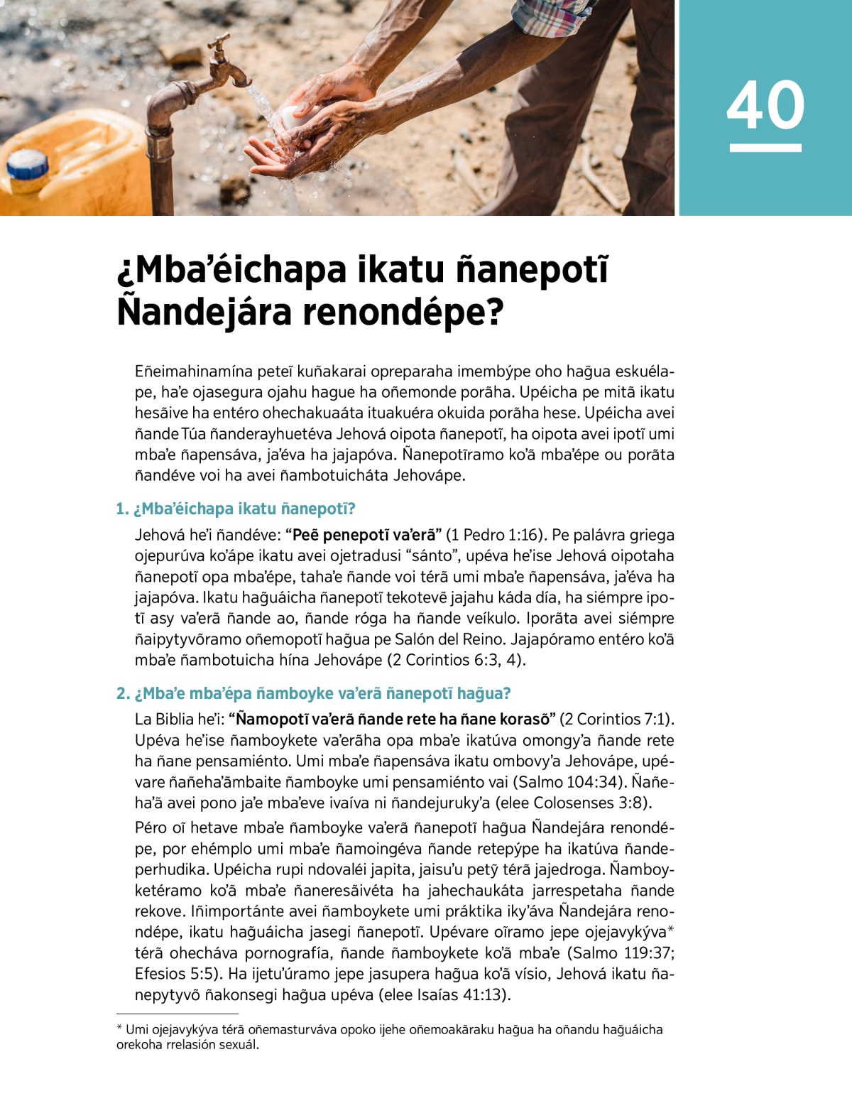 Jehová heʼi ñandéve: “Peẽ penepotĩ vaʼerã” (1 Pedro 1:16). Pe palávra griega ojepurúva koʼápe ikatu avei ojetradusi “sánto”, upéva heʼise Jehová oipotaha ñanepotĩ opa mbaʼépe, tahaʼe ñande voi térã umi mbaʼe ñapensáva, jaʼéva ha jajapóva. Ikatu hag̃uáicha ñanepotĩ tekotevẽ jajahu káda día, ha siémpre ipotĩ asy vaʼerã ñande ao, ñande róga ha ñande veíkulo. Iporãta avei siémpre ñaipytyvõramo oñemopotĩ hag̃ua pe Salón del Reino. Jajapóramo entéro koʼã mbaʼe ñambotuicha hína Jehovápe (2 Corintios 6:3, 4).