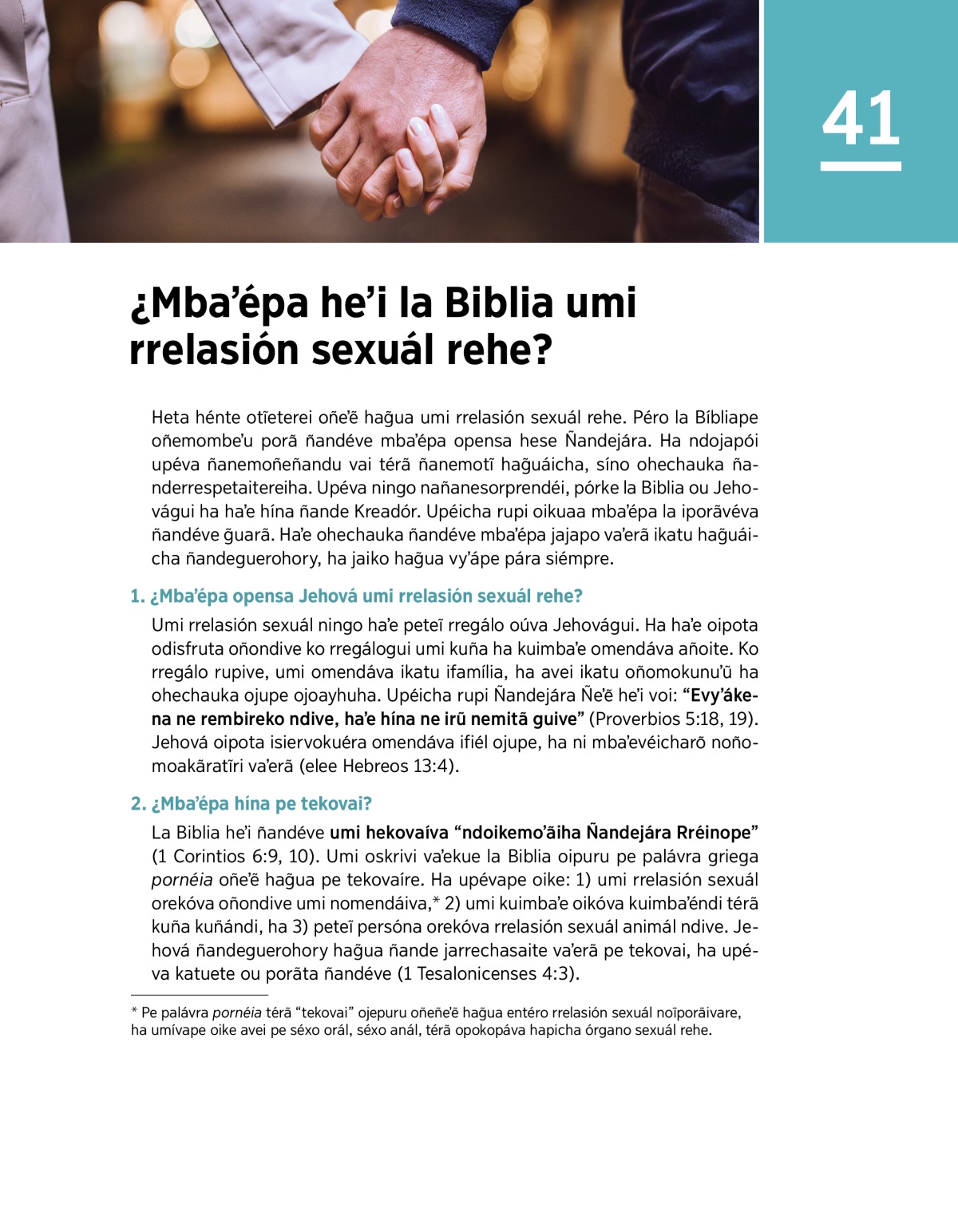 La Biblia heʼi ñandéve umi hekovaíva “ndoikemoʼãiha Ñandejára Rréinope” (1 Corintios 6:9, 10). Umi oskrivi vaʼekue la Biblia oipuru pe palávra griega pornéia oñeʼẽ hag̃ua pe tekovaíre. Ha upévape oike: 1) umi rrelasión sexuál orekóva oñondive umi nomendáiva,a 2) umi kuimbaʼe oikóva kuimbaʼéndi térã kuña kuñándi, ha 3) peteĩ persóna orekóva rrelasión sexuál animál ndive. Jehová ñandeguerohory hag̃ua ñande jarrechasaite vaʼerã pe tekovai, ha upéva katuete ou porãta ñandéve (1 Tesalonicenses 4:3).