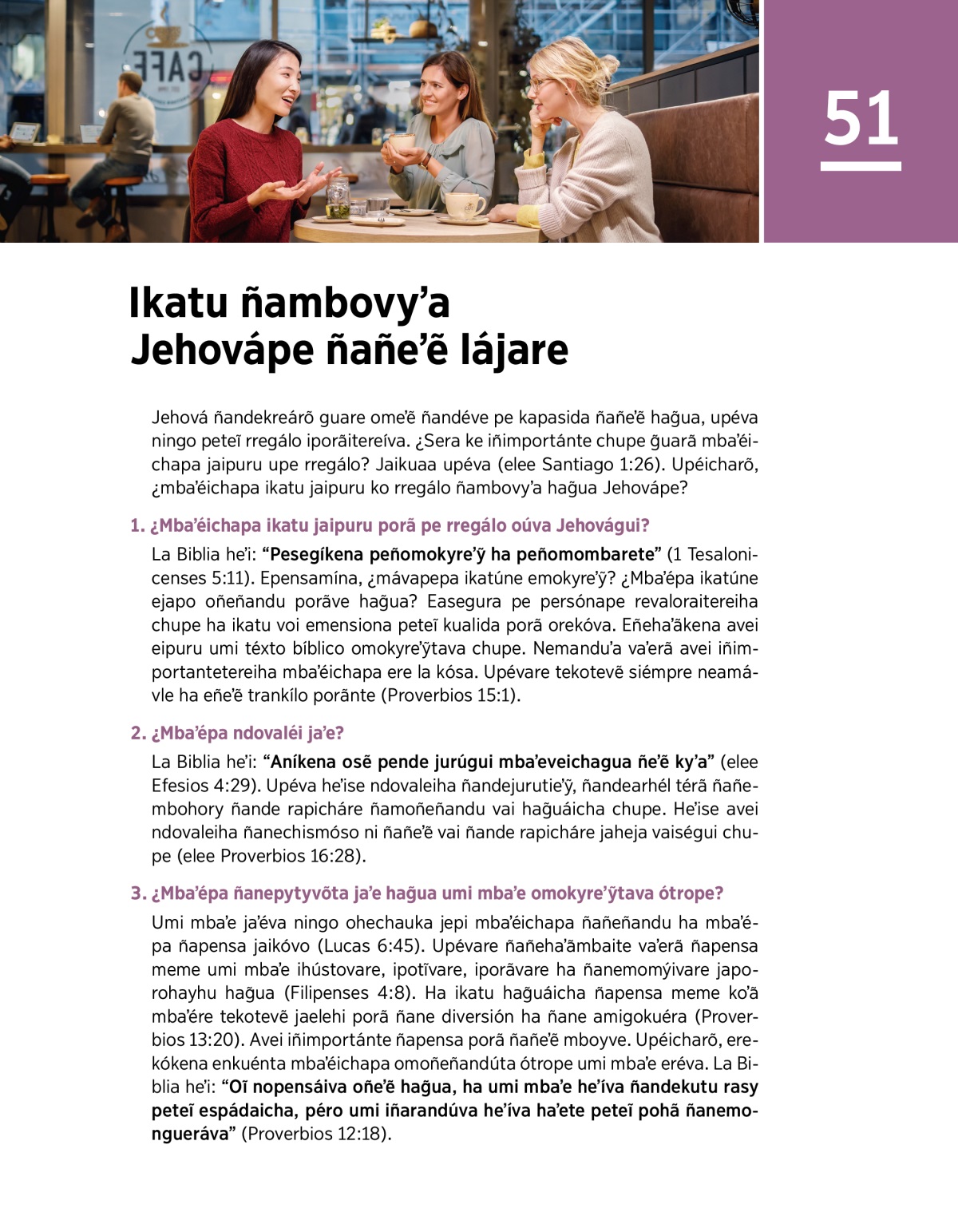 Jehová ñandekreárõ guare omeʼẽ ñandéve pe kapasida ñañeʼẽ hag̃ua, upéva ningo peteĩ rregálo iporãitereíva. ¿Sera ke iñimportánte chupe g̃uarã mbaʼéichapa jaipuru upe rregálo? Jaikuaa upéva (elee Santiago 1:26). Upéicharõ, ¿mbaʼéichapa ikatu jaipuru ko rregálo ñambovyʼa hag̃ua Jehovápe?