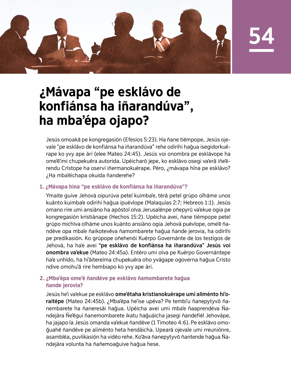 Ymaite guive Jehová oipurúva peteĩ kuimbaʼe, térã peteĩ grúpo oĩháme unos kuánto kuimbaʼe odirihi hag̃ua ipuévlope (Malaquías 2:7; Hebreos 1:1). Jesús omano rire umi ansiáno ha apóstol oĩva Jerusalénpe oñepyrũ vaʼekue ogia pe kongregasión kristiánape (Hechos 15:2). Upéicha avei, ñane tiémpope peteĩ grúpo michĩva oĩháme unos kuánto ansiáno ogia Jehová puévlope, omeʼẽ ñandéve opa mbaʼe ñaikotevẽva ñamombarete hag̃ua ñande jerovia, ha odirihi pe predikasión. Ko grúpope oñehenói Kuérpo Governánte de los testigos de Jehová, ha haʼe avei “pe esklávo de konfiánsa ha iñarandúva” Jesús voi onombra vaʼekue (Mateo 24:45a). Entéro umi oĩva pe Kuérpo Governántepe haʼe unhído, ha hiʼãitereíma chupekuéra oho yvágape ogoverna hag̃ua Cristo ndive omohuʼã rire hembiapo ko yvy ape ári.
