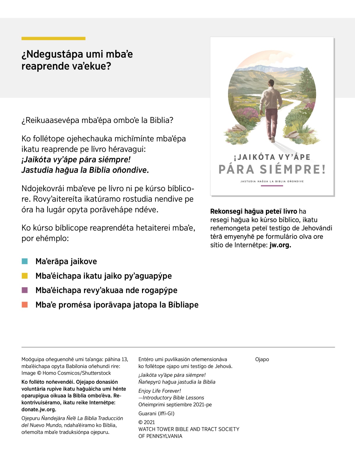 Ko follétope ojehechauka michĩmínte mbaʼépa ikatu reaprende pe lívro héravagui: ¡Jaikóta vyʼápe pára siémpre! Jastudia hag̃ua la Biblia oñondive.