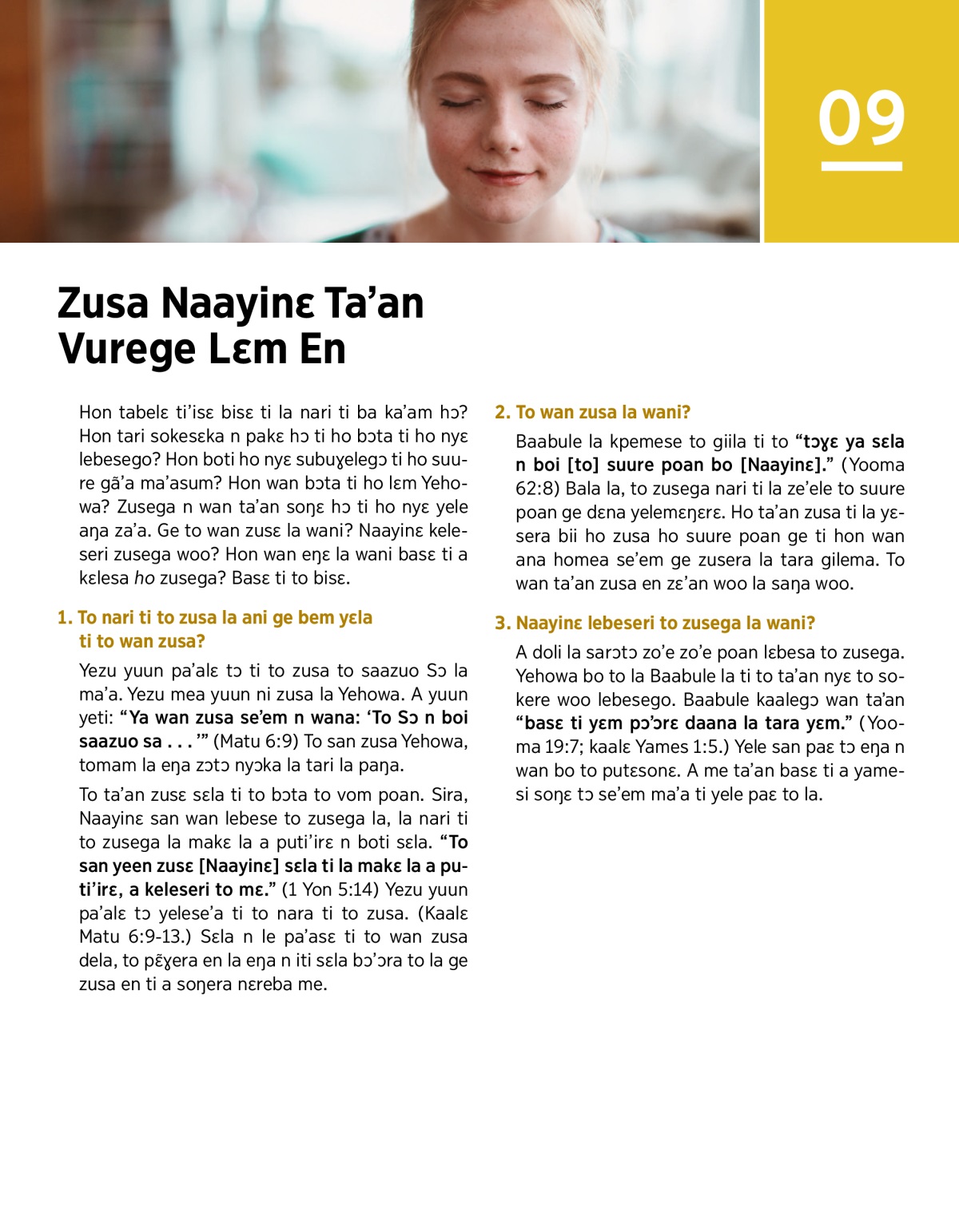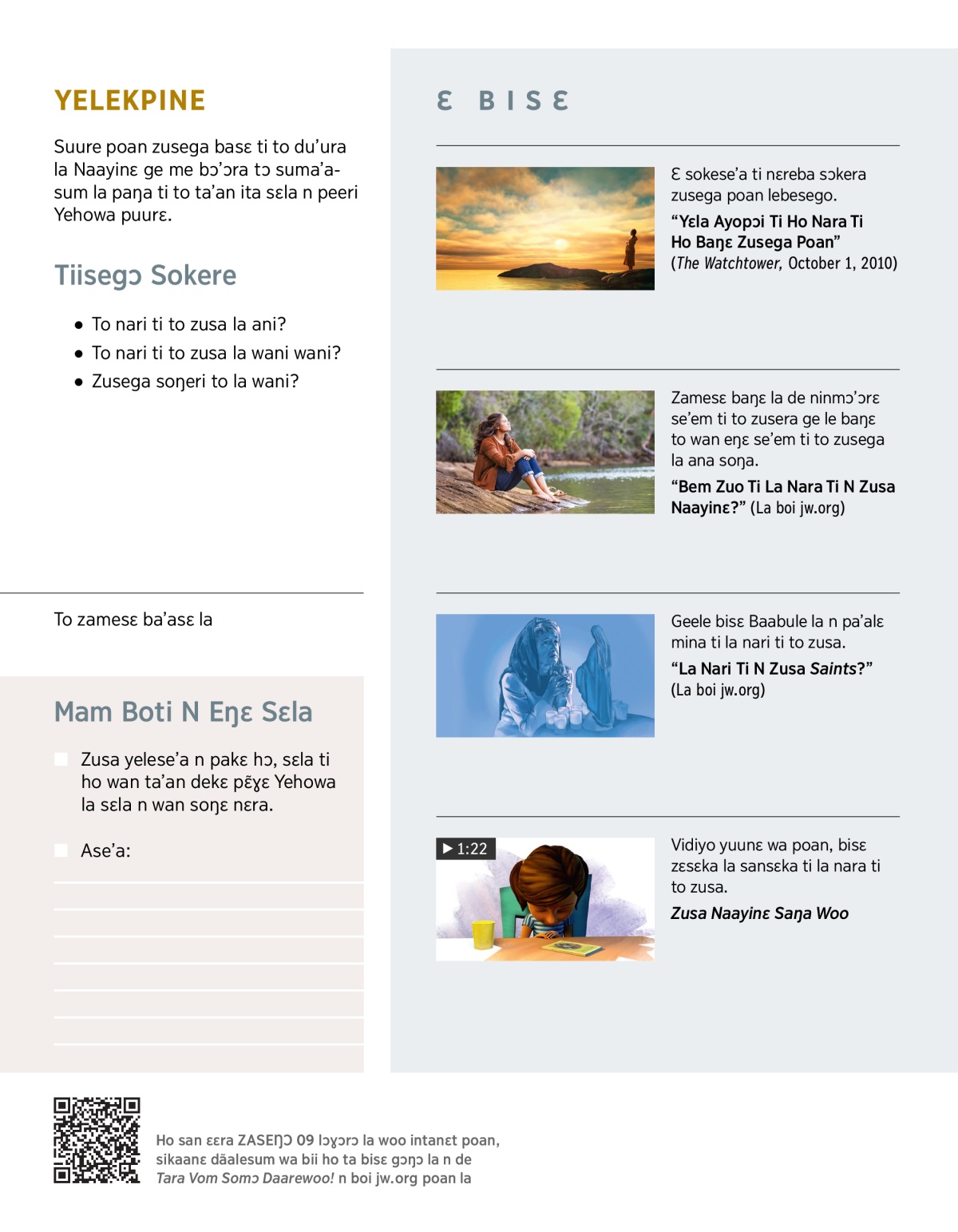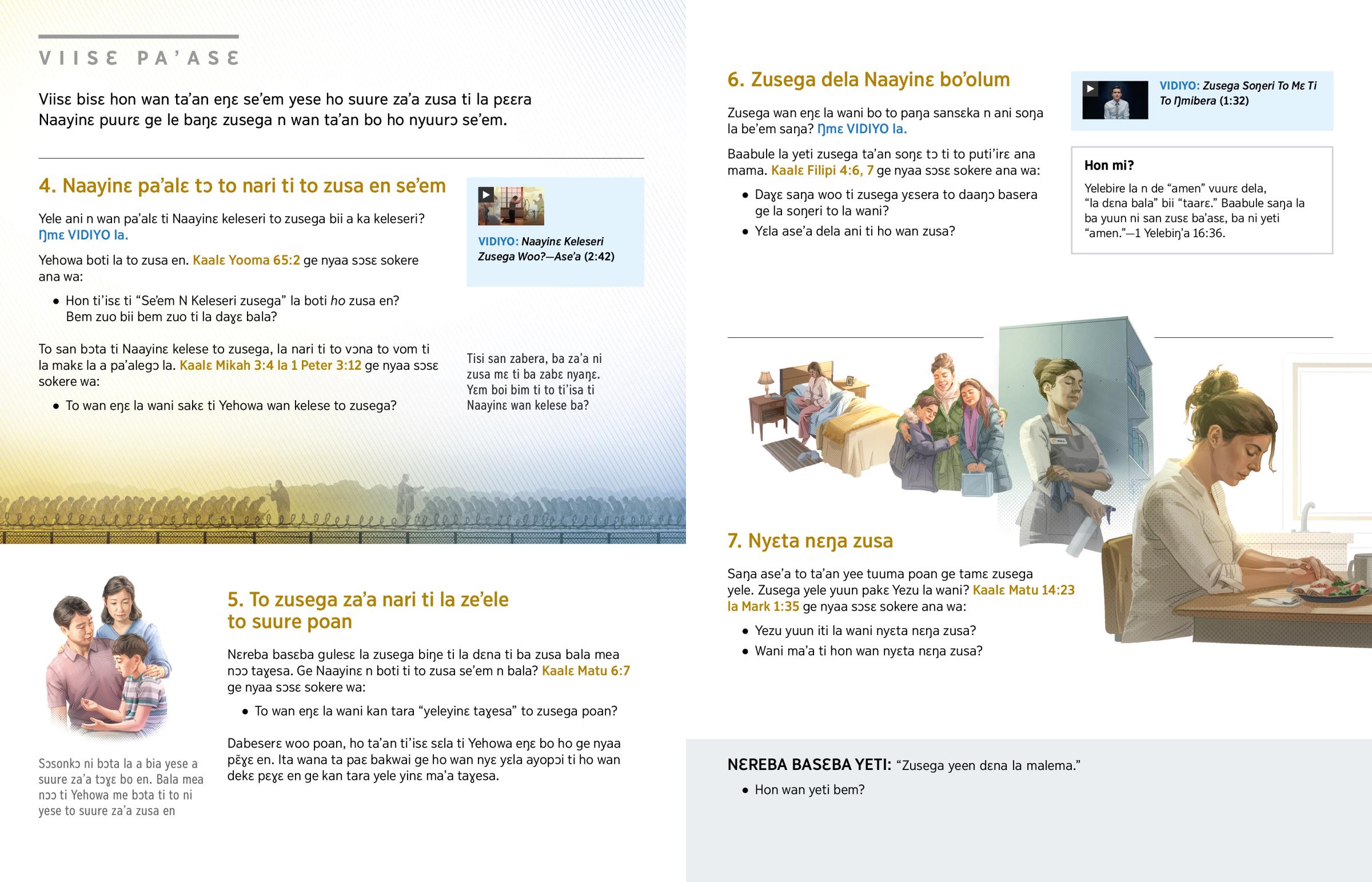 Hon tabelɛ ti’isɛ bisɛ ti la nari ti ba ka’am hɔ? Hon tari sokesɛka n pakɛ hɔ ti ho bɔta ti ho nyɛ lebesego? Hon boti ho nyɛ subuɣelegɔ ti ho suure gã’a ma’asum? Hon wan bɔta ti ho lɛm Yehowa? Zusega n wan ta’an soŋɛ hɔ ti ho nyɛ yele aŋa za’a. Ge to wan zusɛ la wani? Naayinɛ keleseri zusega woo? Hon wan eŋɛ la wani basɛ ti a kɛlesa ho zusega? Basɛ ti to bisɛ.