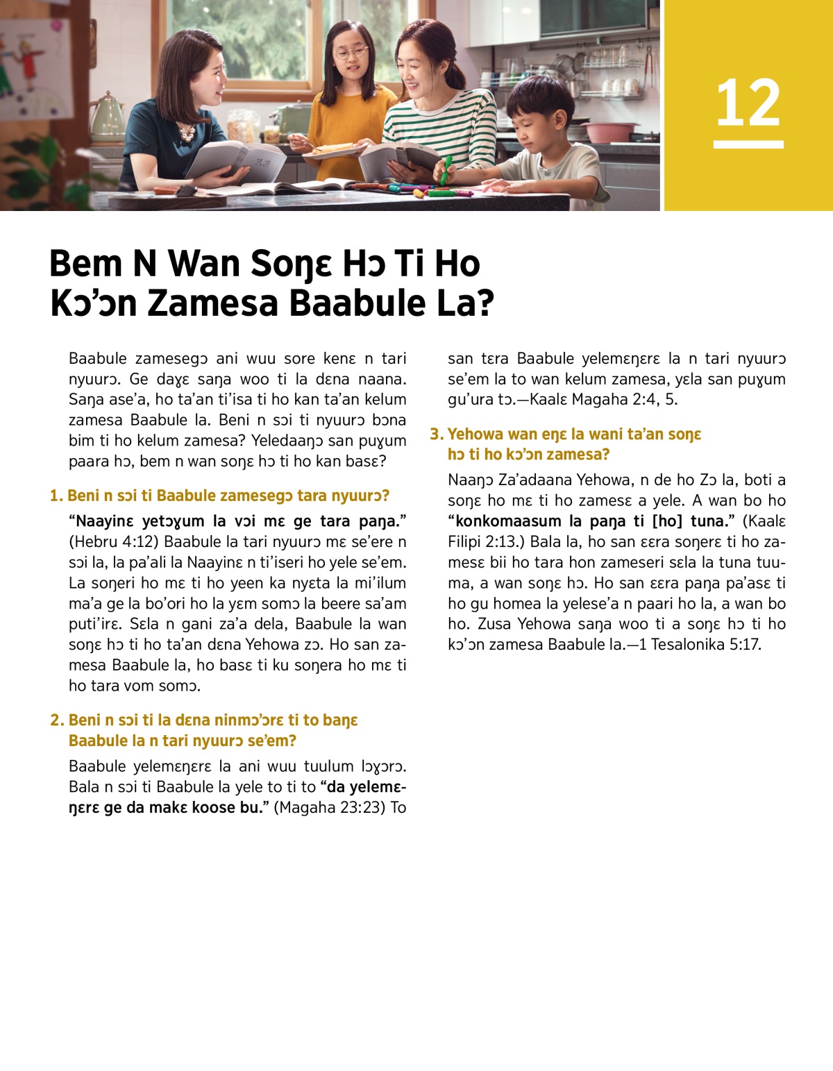 “Naayinɛ yetɔɣum la vɔi mɛ ge tara paŋa.” (Hebru 4:12) Baabule la tari nyuurɔ mɛ se’ere n sɔi la, la pa’ali la Naayinɛ n ti’iseri ho yele se’em. La soŋeri ho mɛ ti ho yeen ka nyɛta la mi’ilum ma’a ge la bo’ori ho la yɛm somɔ la beere sa’am puti’irɛ. Sɛla n gani za’a dela, Baabule la wan soŋɛ hɔ ti ho ta’an dɛna Yehowa zɔ. Ho san zamesa Baabule la, ho basɛ ti ku soŋera ho mɛ ti ho tara vom somɔ.