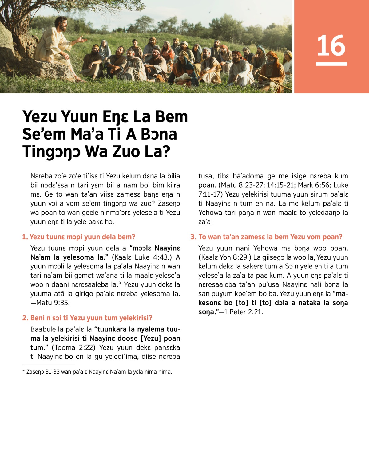 Nɛreba zo’e zo’e ti’isɛ ti Yezu kelum dɛna la bilia bii nɔdɛ’ɛsa n tari yɛm bii a nam boi bim kiira mɛ. Ge to wan ta’an viisɛ zamesɛ baŋɛ eŋa n yuun vɔi a vom se’em tingɔŋɔ wa zuo? Zaseŋɔ wa poan to wan geele ninmɔ’ɔrɛ yelese’a ti Yezu yuun eŋɛ ti la yele pakɛ hɔ.