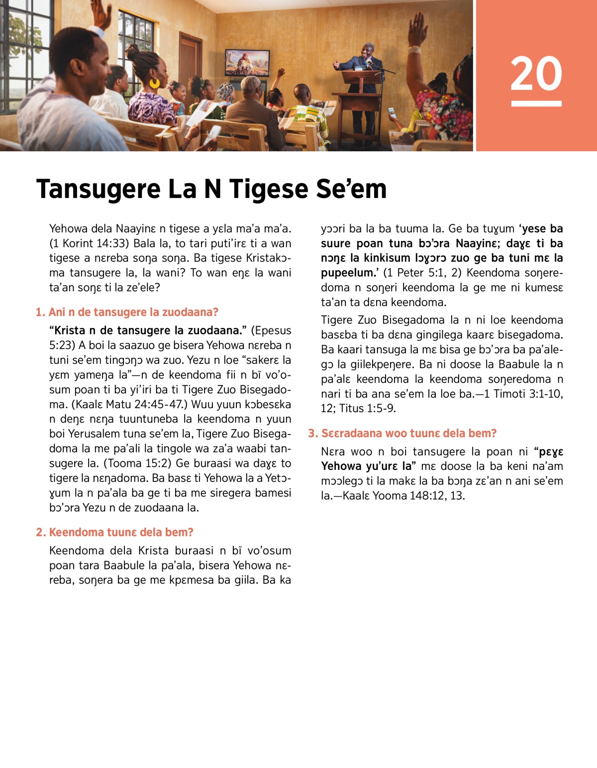 “Krista n de tansugere la zuodaana.” (Epesus 5:23) A boi la saazuo ge bisera Yehowa nɛreba n tuni se’em tingɔŋɔ wa zuo. Yezu n loe “sakerɛ la yɛm yameŋa la” ​—n de keendoma fii n bĩ vo’osum poan ti ba yi’iri ba ti Tigere Zuo Bisegadoma. (Kaalɛ Matu 24:45-47.) Wuu yuun kɔbesɛka n deŋɛ nɛŋa tuuntuneba la keendoma n yuun boi Yerusalem tuna se’em la, Tigere Zuo Bisegadoma la me pa’ali la tingole wa za’a waabi tansugere la. (Tooma 15:2) Ge buraasi wa daɣɛ to tigere la nɛŋadoma. Ba basɛ ti Yehowa la a Yetɔɣum la n pa’ala ba ge ti ba me siregera bamesi bɔ’ɔra Yezu n de zuodaana la.
