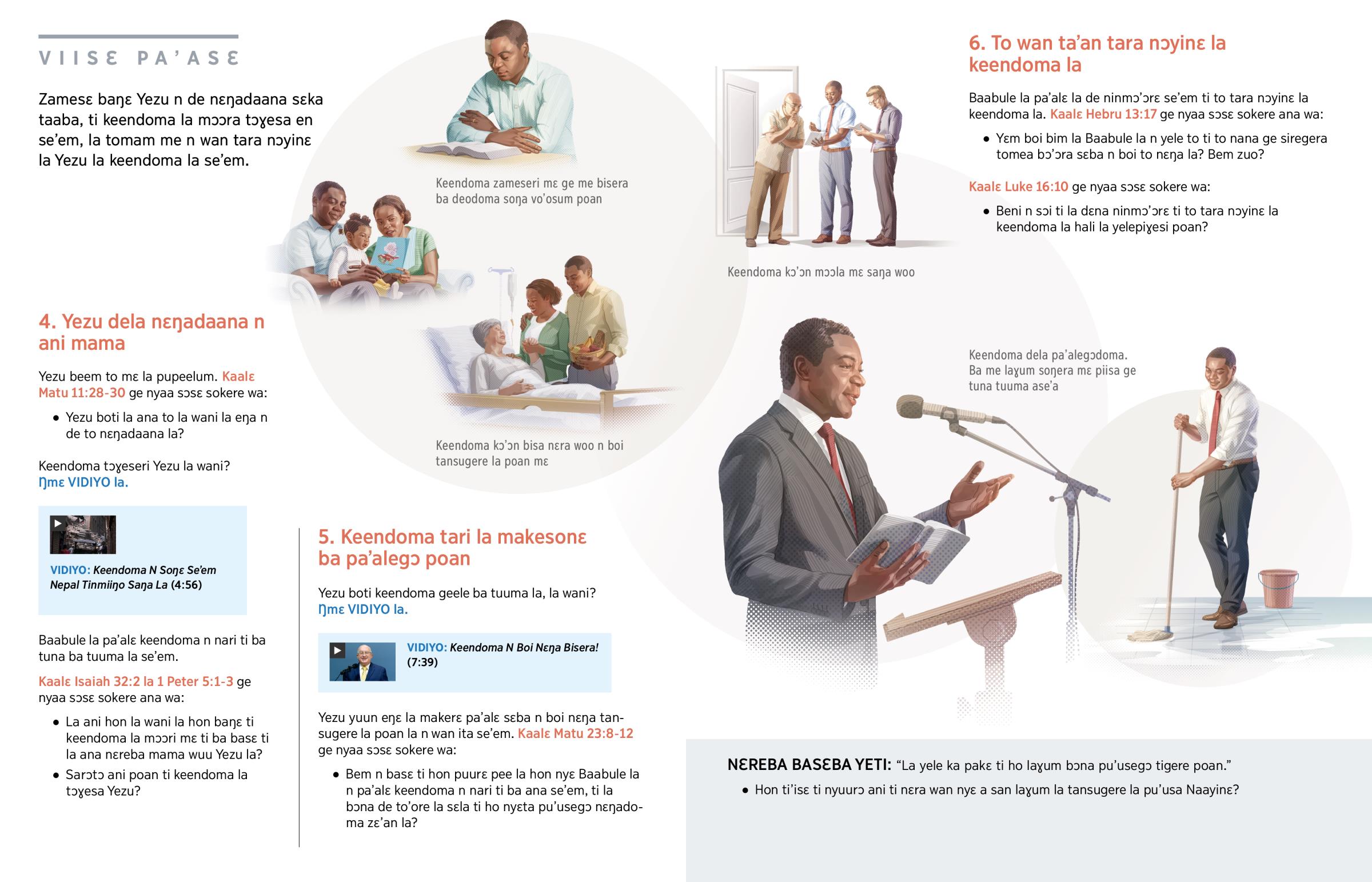 Keendoma dela Krista buraasi n bĩ vo’osum poan tara Baabule la pa’ala, bisera Yehowa nɛreba, soŋera ba ge me kpɛmesa ba giila. Ba ka yɔɔri ba la ba tuuma la. Ge ba tuɣum ‘yese ba suure poan tuna bɔ’ɔra Naayinɛ; daɣɛ ti ba nɔŋɛ la kinkisum lɔɣɔrɔ zuo ge ba tuni mɛ la pupeelum.’ (1 Peter 5:1, 2) Keendoma soŋeredoma n soŋeri keendoma la ge me ni kumesɛ ta’an ta dɛna keendoma.