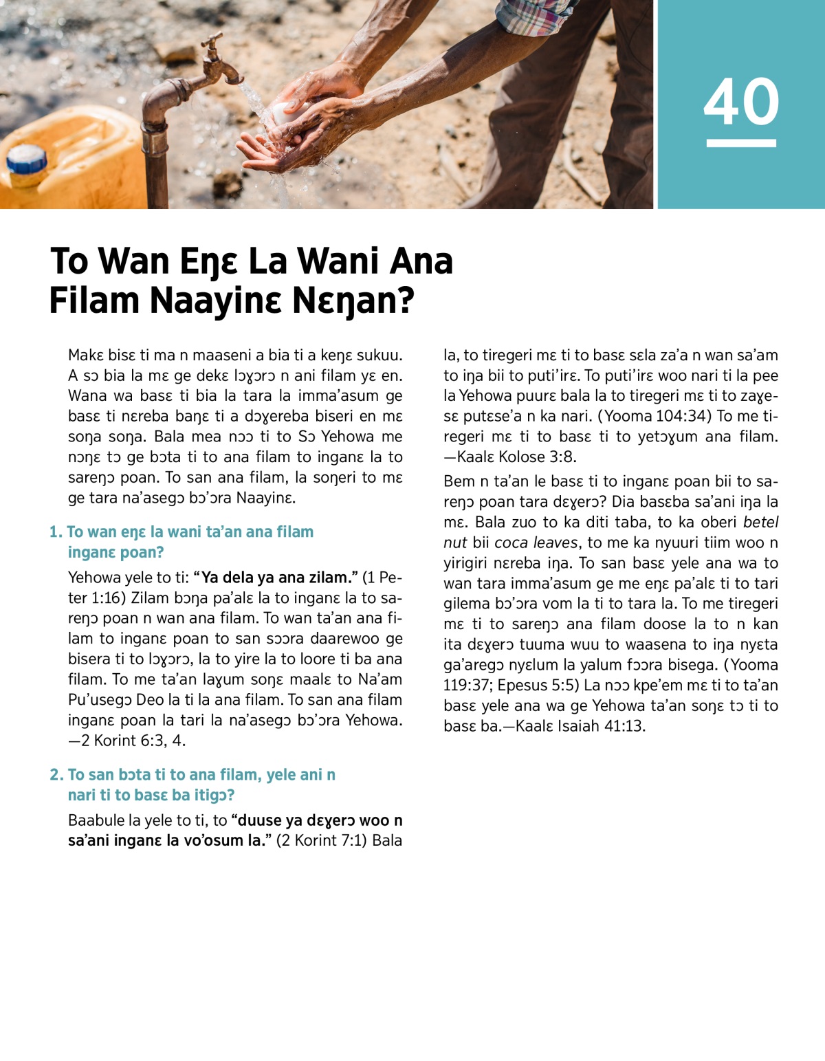 Yehowa yele to ti: “Ya dela ya ana zilam.” (1 Peter 1:16) Zilam bɔŋa pa’alɛ la to inganɛ la to sareŋɔ poan n wan ana filam. To wan ta’an ana filam to inganɛ poan to san sɔɔra daarewoo ge bisera ti to lɔɣɔrɔ, la to yire la to loore ti ba ana filam. To me ta’an laɣum soŋɛ maalɛ to Na’am Pu’usegɔ Deo la ti la ana filam. To san ana filam inganɛ poan la tari la na’asegɔ bɔ’ɔra Yehowa.—2 Korint 6:3, 4.