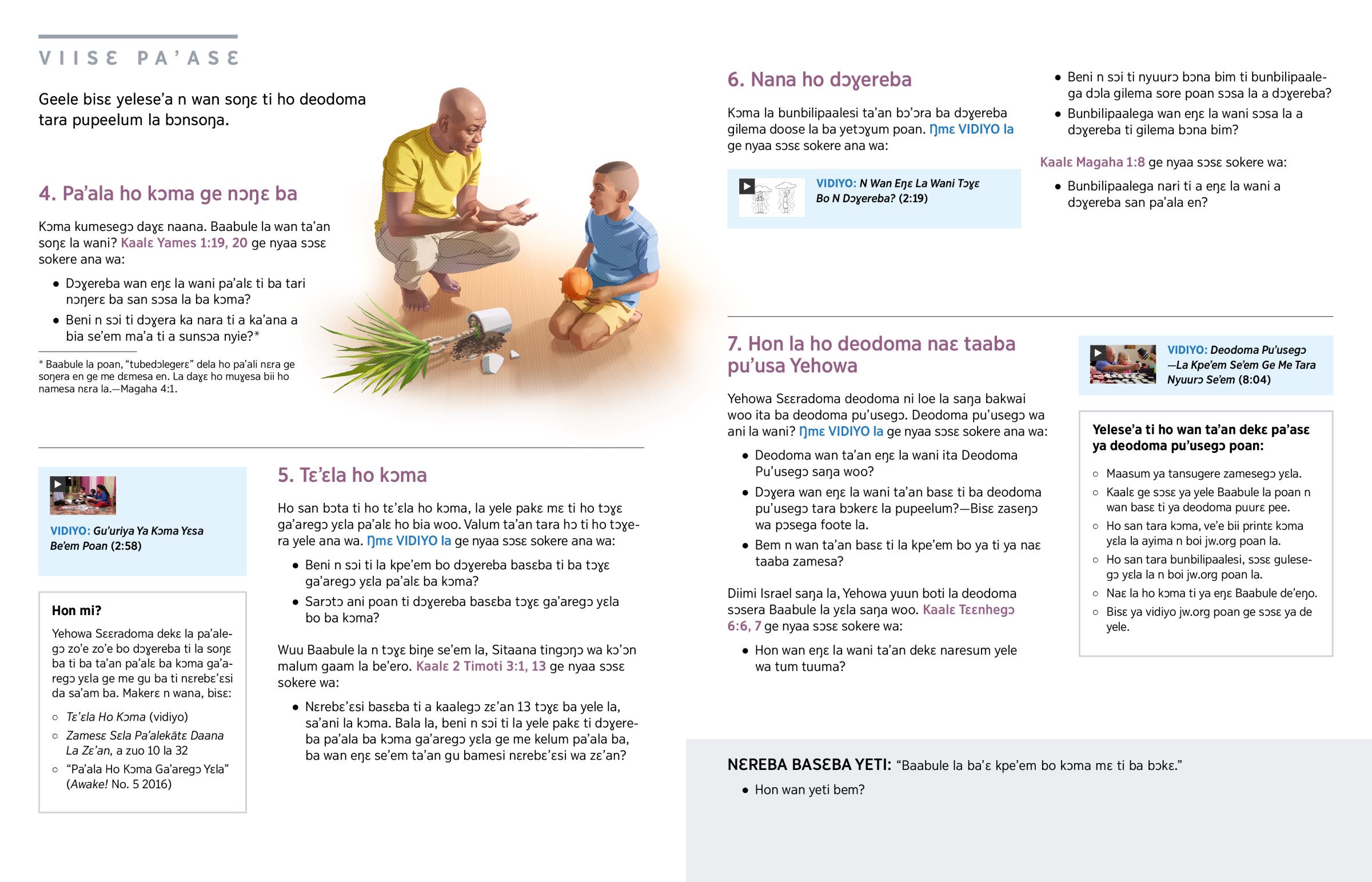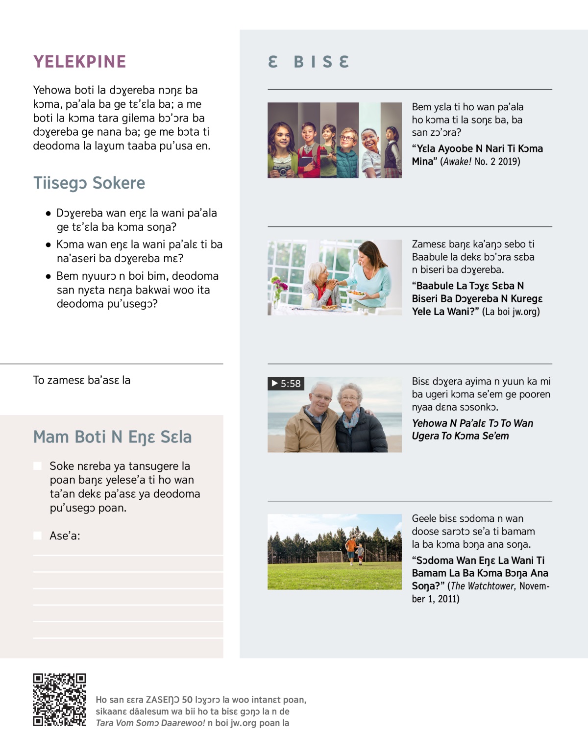 Yehowa Sɛɛradoma dekɛ la pa’alegɔ zo’e zo’e bo dɔɣereba ti la soŋɛ ba ti ba ta’an pa’alɛ ba kɔma ga’aregɔ yɛla ge me gu ba ti nɛrebɛ’ɛsi da sa’am ba. Makerɛ n wana, bisɛ: