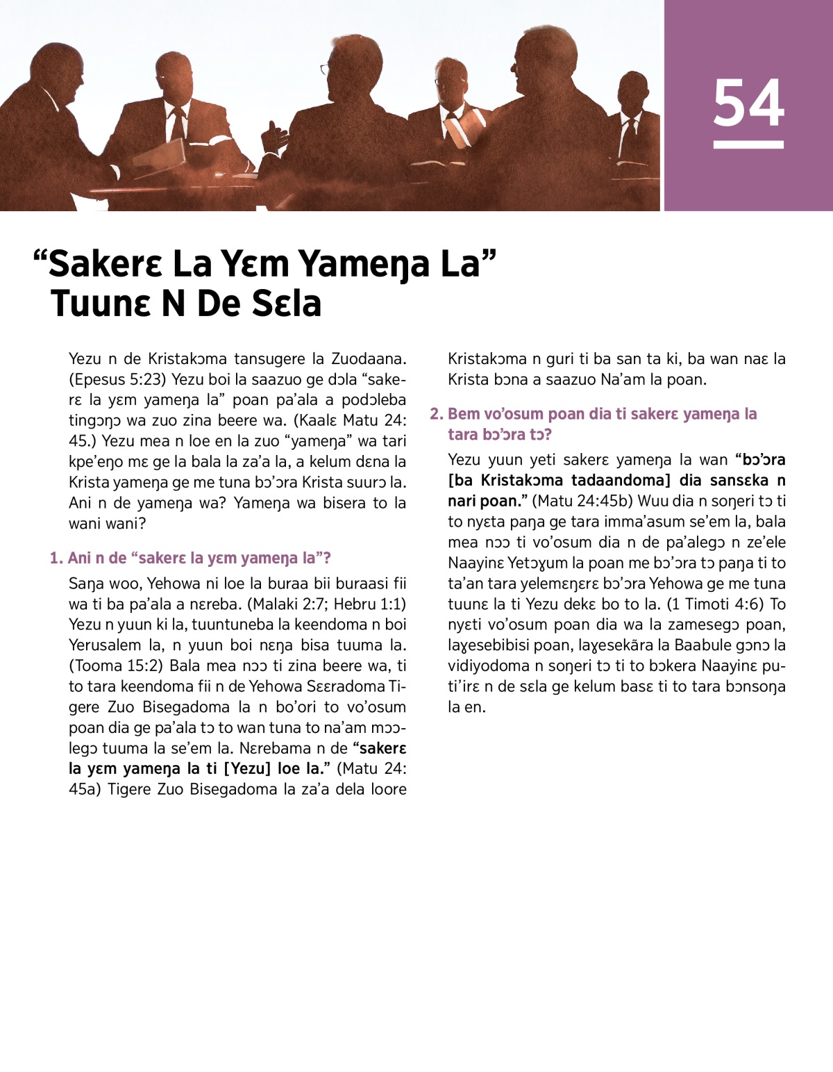 Saŋa woo, Yehowa ni loe la buraa bii buraasi fii wa ti ba pa’ala a nɛreba. (Malaki 2:7; Hebru 1:1) Yezu n yuun ki la, tuuntuneba la keendoma n boi Yerusalem la, n yuun boi nɛŋa bisa tuuma la. (Tooma 15:2) Bala mea nɔɔ ti zina beere wa, ti to tara keendoma fii n de Yehowa Sɛɛradoma Tigere Zuo Bisegadoma la n bo’ori to vo’osum poan dia ge pa’ala tɔ to wan tuna to na’am mɔɔlegɔ tuuma la se’em la. Nɛrebama n de “sakerɛ la yɛm yameŋa la ti [Yezu] loe la.” (Matu 24:45a) Tigere Zuo Bisegadoma la za’a dela loore Kristakɔma n guri ti ba san ta ki, ba wan naɛ la Krista bɔna a saazuo Na’am la poan.