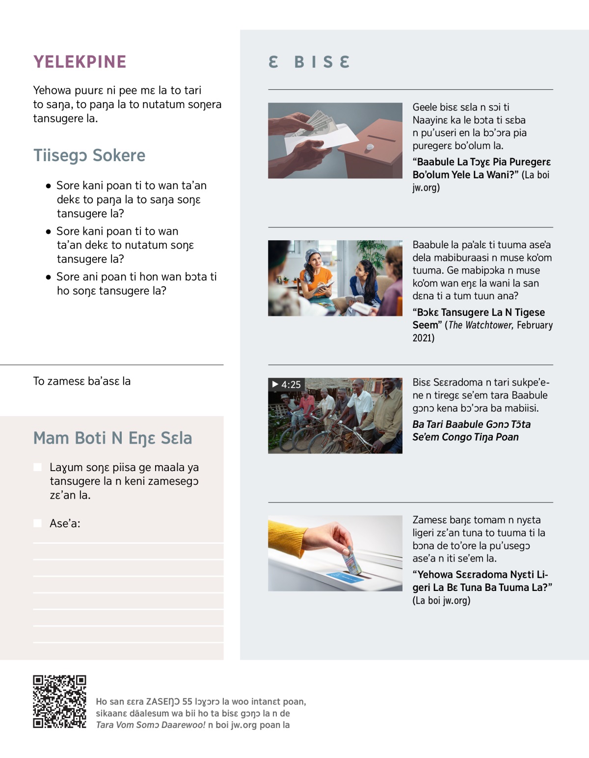 “Bɔkɛ Tansugere La N Tigese Seem” (The Watchtower, February 2021)