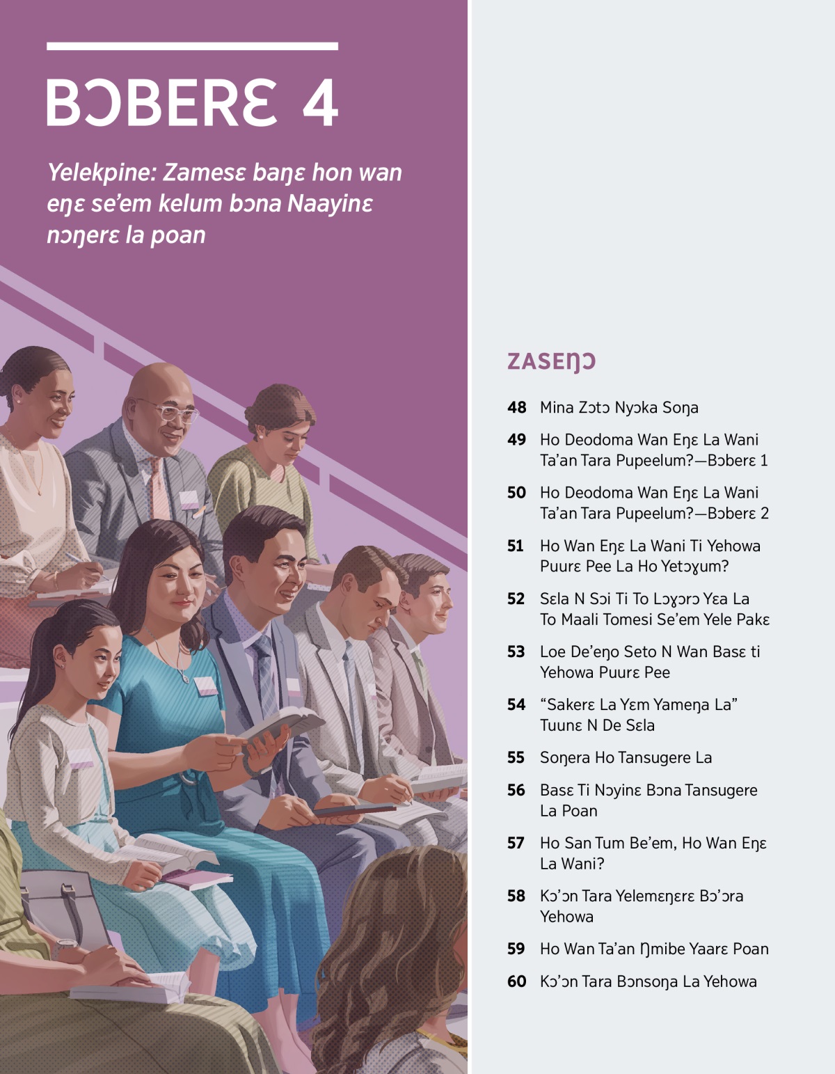 Bɔberɛ 4 Gɔnseko Ti Ba Printɛ Yelekpine: Zamesɛ baŋɛ hon wan eŋɛ se’em kelum bɔna Naayinɛ nɔŋerɛ la poan ZASEŊƆ 48 Mina Zɔtɔ Nyɔka Soŋa 49 Ho Deodoma Wan Eŋɛ La Wani Ta’an Tara Pupeelum?—Bɔberɛ 1 50 Ho Deodoma Wan Eŋɛ La Wani Ta’an Tara Pupeelum?—Bɔberɛ 2 51 Ho Wan Eŋɛ La Wani Ti Yehowa Puurɛ Pee La Ho Yetɔɣum? 52 Sɛla N Sɔi Ti To Lɔɣɔrɔ Yɛa La To Maali Tomesi Se’em Yele Pakɛ 53 Loe De’eŋo Seto N Wan Basɛ ti Yehowa Puurɛ Pee 54 “Sakerɛ La Yɛm Yameŋa La” Tuunɛ N De Sɛla 55 Soŋera Ho Tansugere La 56 Basɛ Ti Nɔyinɛ Bɔna Tansugere La Poan 57 Ho San Tum Be’em, Ho Wan Eŋɛ La Wani? 58 Kɔ’ɔn Tara Yelemɛŋɛrɛ Bɔ’ɔra Yehowa 59 Ho Wan Ta’an Ŋmibe Yaarɛ Poan 60 Kɔ’ɔn Tara Bɔnsoŋa La Yehowa