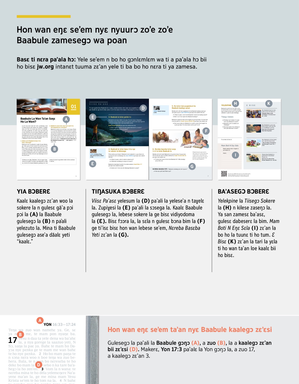 Gulesegɔ la pa’ali la Baabule gɔŋɔ (A), a zuo (B), la a kaalegɔ zɛ’an bii zɛ’ɛsi (D). Makerɛ, Yon 17:3 pa’alɛ la Yon gɔŋɔ la, a zuo 17, a kaalegɔ zɛ’an 3.