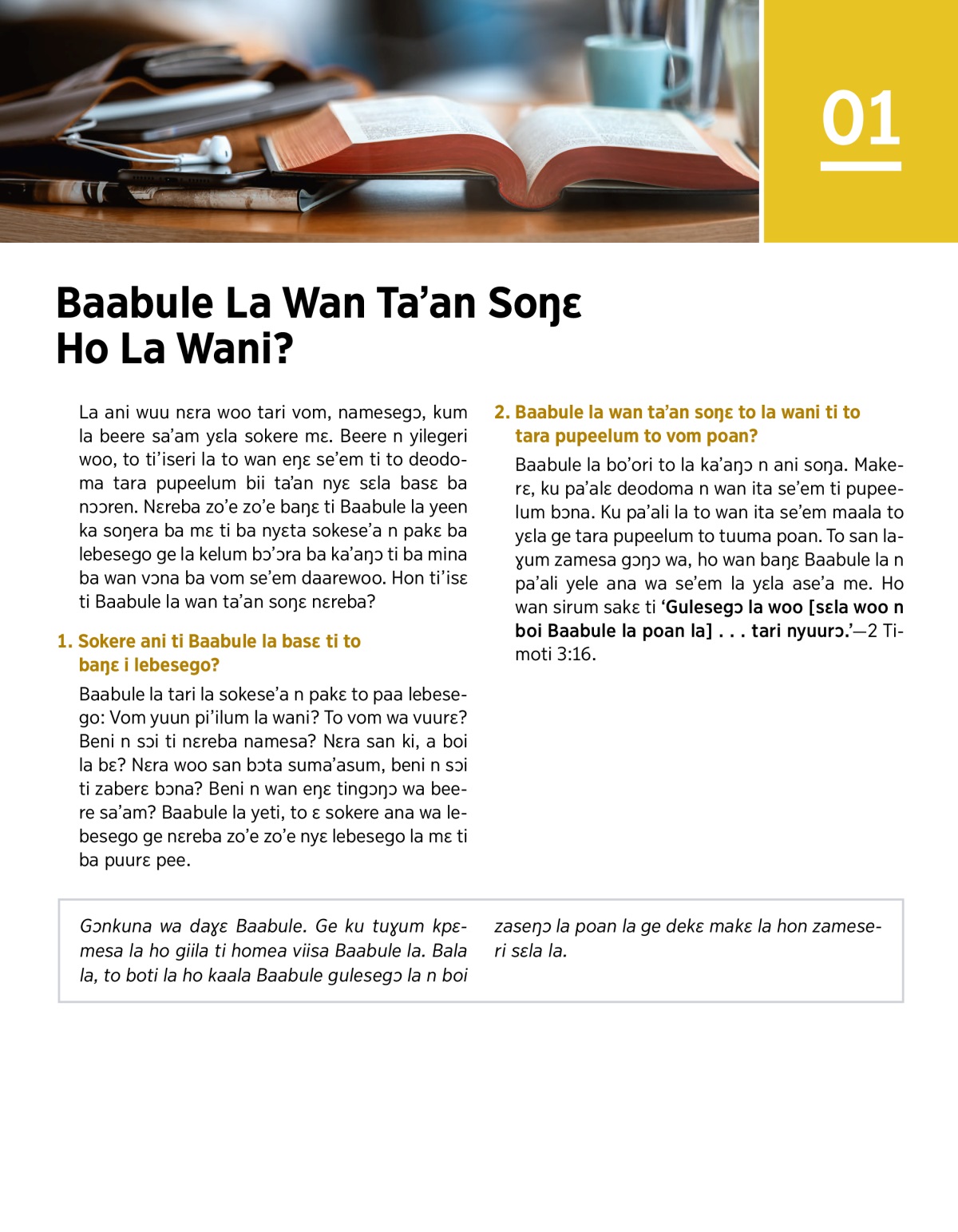 Baabule la bo’ori to la ka’aŋɔ n ani soŋa. Makerɛ, ku pa’alɛ deodoma n wan ita se’em ti pupeelum bɔna. Ku pa’ali la to wan ita se’em maala to yɛla ge tara pupeelum to tuuma poan. To san laɣum zamesa gɔŋɔ wa, ho wan baŋɛ Baabule la n pa’ali yele ana wa se’em la yɛla ase’a me. Ho wan sirum sakɛ ti ‘Gulesegɔ la woo [sɛla woo n boi Baabule la poan la] . . . tari nyuurɔ.ʼ—2 Timoti 3:16.