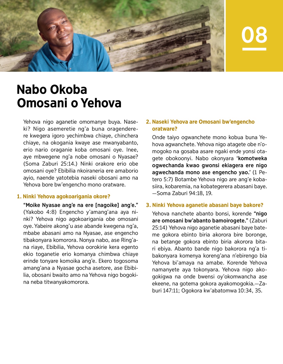 Yehova nigo aganetie omomanye buya. Naseki? Nigo asemeretie ng’a buna oragenderere kwegera igoro yechimbwa chiaye, chinchera chiaye, na okogania kwaye ase mwanyabanto, erio nario oraganie koba omosani oye. Inee, aye mbwegene ng’a nobe omosani o Nyasae? (Soma Zaburi 25:14.) Ninki orakore erio obe omosani oye? Ebibilia nkoiraneria ere amaborio ayio, naende yatotebia naseki obosani amo na Yehova bore bw’engencho mono oratware.