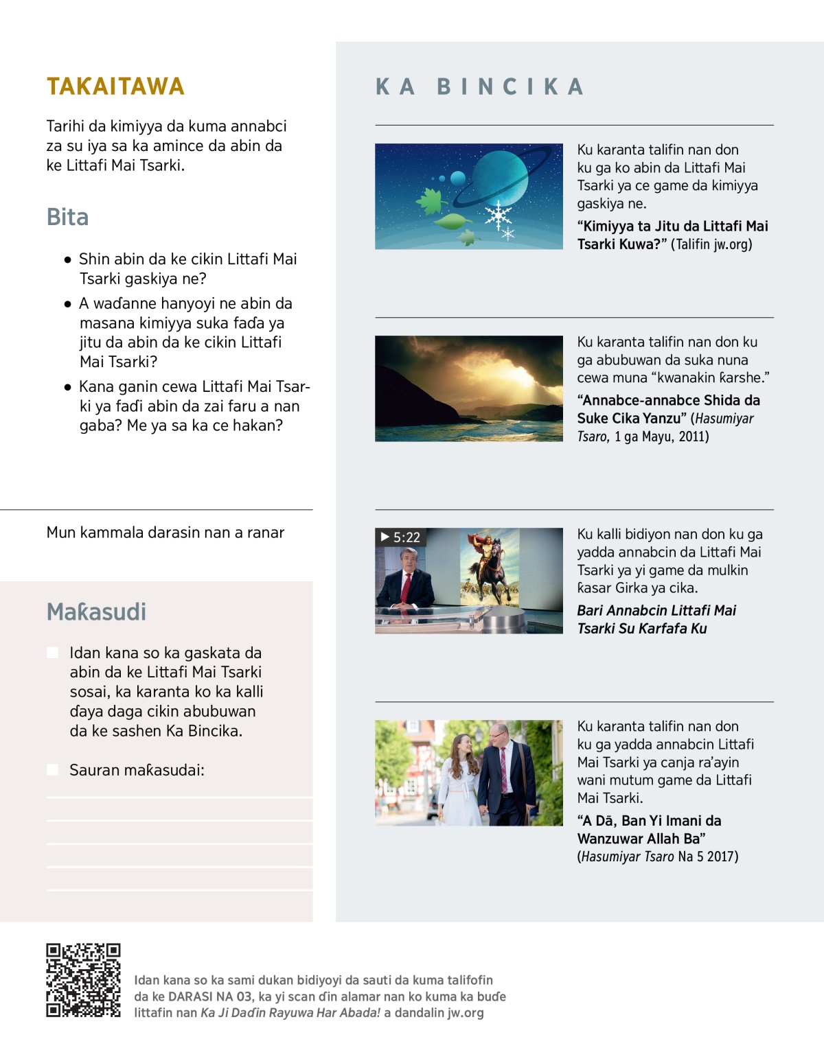 An annabtaa abubuwa da yawa a Littafi Mai Tsarki da ba su “faru ba” tukun. (Ishaya 46:10) An annabta abubuwa da dama shekaru da yawa kafin su faru. Kuma an bayyana dalla-dalla abubuwan da suke faruwa a duniya a yau. A wannan darasin, za mu tattauna wasu cikin waɗannan annabce-annabcen. Ganin yadda suke cika yana da ban-sha’awa!