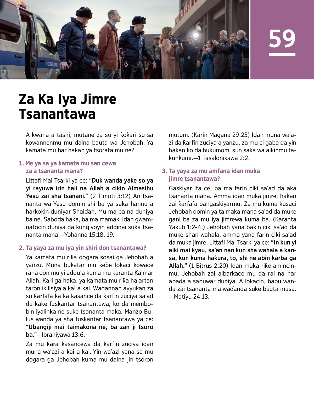 Gaskiyar ita ce, ba ma farin ciki sa’ad da aka tsananta mana. Amma idan muka jimre, hakan zai ƙarfafa bangaskiyarmu. Za mu kuma kusaci Jehobah domin ya taimaka mana sa’ad da muke gani ba za mu iya jimrewa kuma ba. (Karanta Yakub 1:2-4.) Jehobah yana baƙin ciki sa’ad da muke shan wahala, amma yana farin ciki sa’ad da muka jimre. Littafi Mai Tsarki ya ce: “In kun yi aiki mai kyau, sa’an nan kun sha wahala a kansa, kun kuma haƙura, to, shi ne abin karɓa ga Allah.” (1 Bitrus 2:20) Idan muka riƙe amincinmu, Jehobah zai albarkace mu da rai na har abada a sabuwar duniya. A lokacin, babu wanda zai tsananta ma waɗanda suke bauta masa.—Matiyu 24:13.