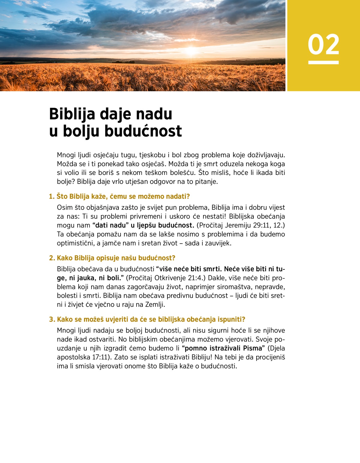 Osim što objašnjava zašto je svijet pun problema, Biblija ima i dobru vijest za nas: Ti su problemi privremeni i uskoro će nestati! Biblijska obećanja mogu nam “dati nadu” u ljepšu budućnost. (Pročitaj Jeremiju 29:11, 12.) Ta obećanja pomažu nam da se lakše nosimo s problemima i da budemo optimistični, a jamče nam i sretan život – sada i zauvijek.