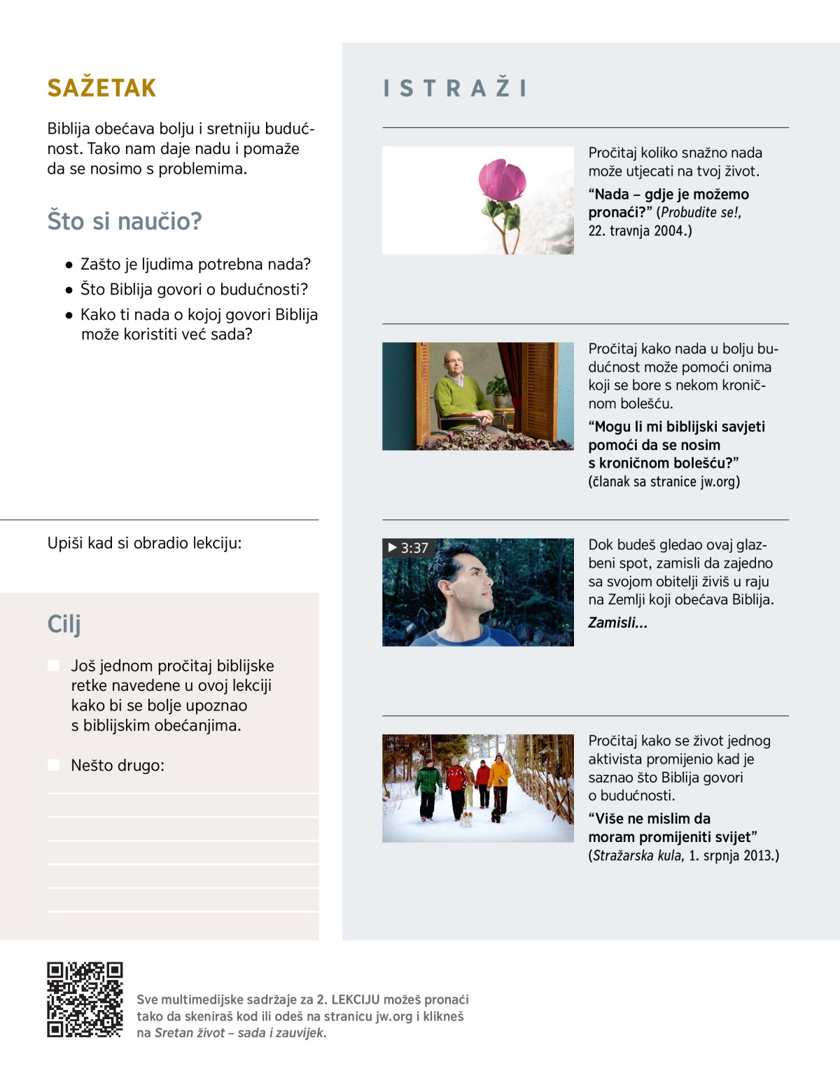 U ovom dijelu saznat ćeš: Kako će izgledati život u svijetu o kojem govori Biblija? Kako nada koju daje Biblija koristi ljudima već danas?