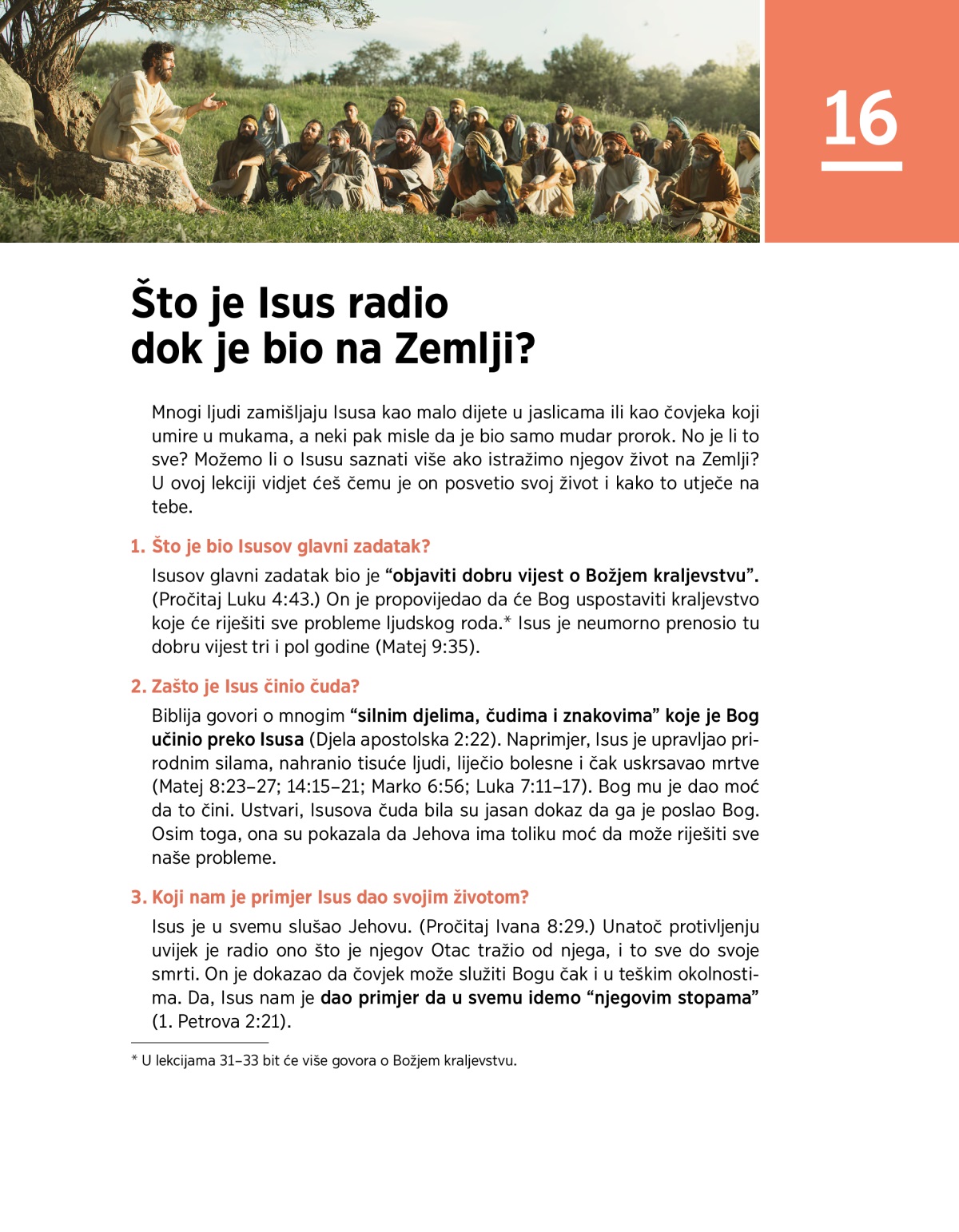 Mnogi ljudi zamišljaju Isusa kao malo dijete u jaslicama ili kao čovjeka koji umire u mukama, a neki pak misle da je bio samo mudar prorok. No je li to sve? Možemo li o Isusu saznati više ako istražimo njegov život na Zemlji? U ovoj lekciji vidjet ćeš čemu je on posvetio svoj život i kako to utječe na tebe.