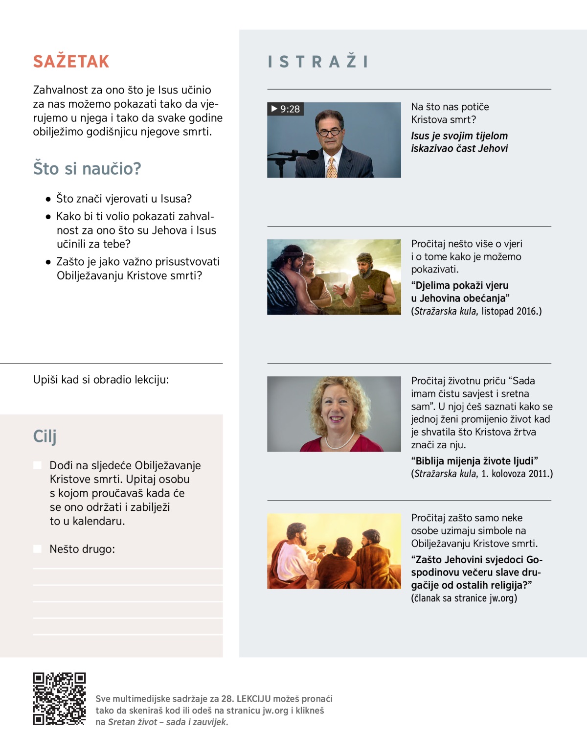 U ovom dijelu saznat ćeš na koje još načine možemo pokazati zahvalnost za veliku ljubav koju su nam pokazali Jehova i Isus. Koliko je važno obilježavati godišnjicu Kristove smrti?