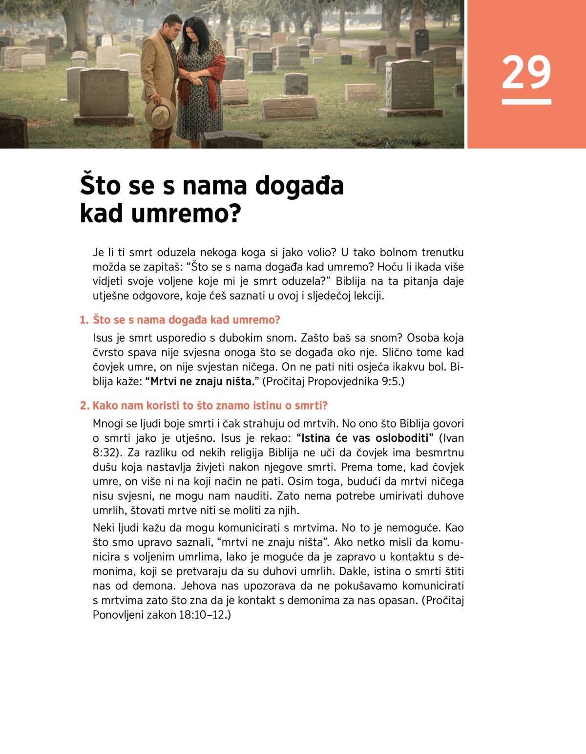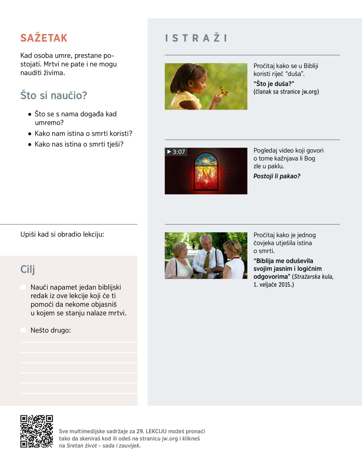 Je li ti smrt oduzela nekoga koga si jako volio? U tako bolnom trenutku možda se zapitaš: “Što se s nama događa kad umremo? Hoću li ikada više vidjeti svoje voljene koje mi je smrt oduzela?” Biblija na ta pitanja daje utješne odgovore, koje ćeš saznati u ovoj i sljedećoj lekciji.