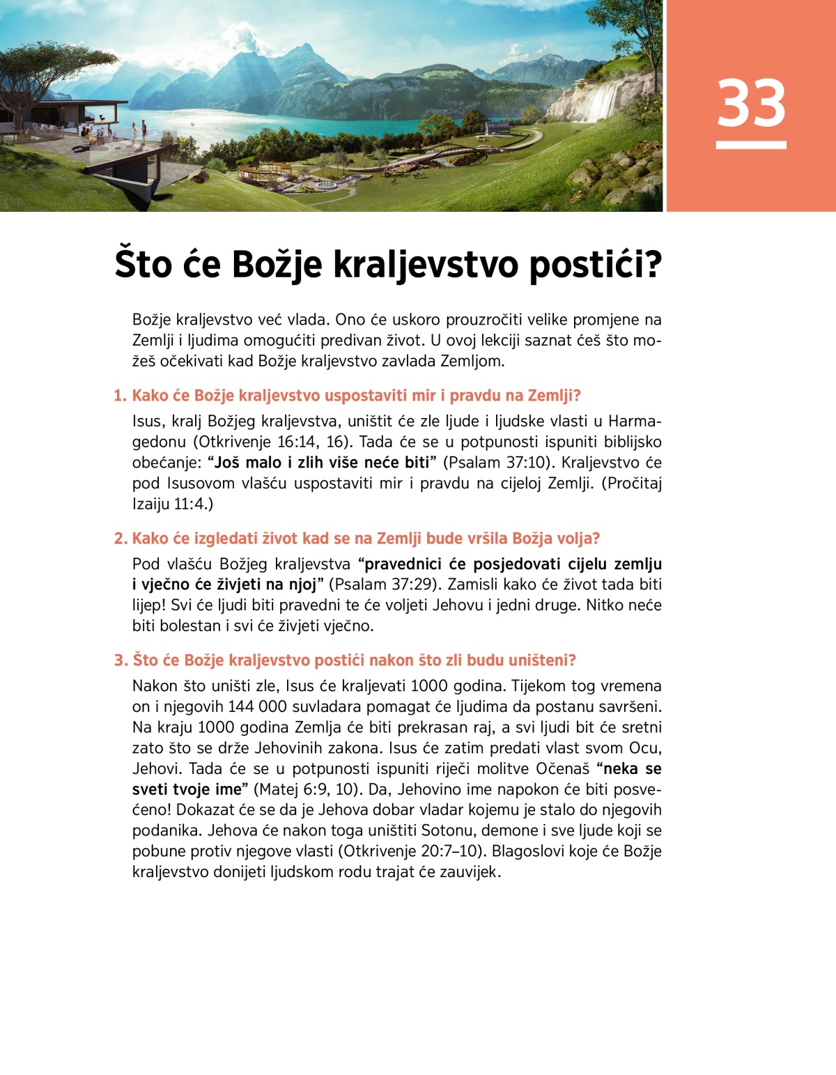Božje kraljevstvo već vlada. Ono će uskoro prouzročiti velike promjene na Zemlji i ljudima omogućiti predivan život. U ovoj lekciji saznat ćeš što možeš očekivati kad Božje kraljevstvo zavlada Zemljom.