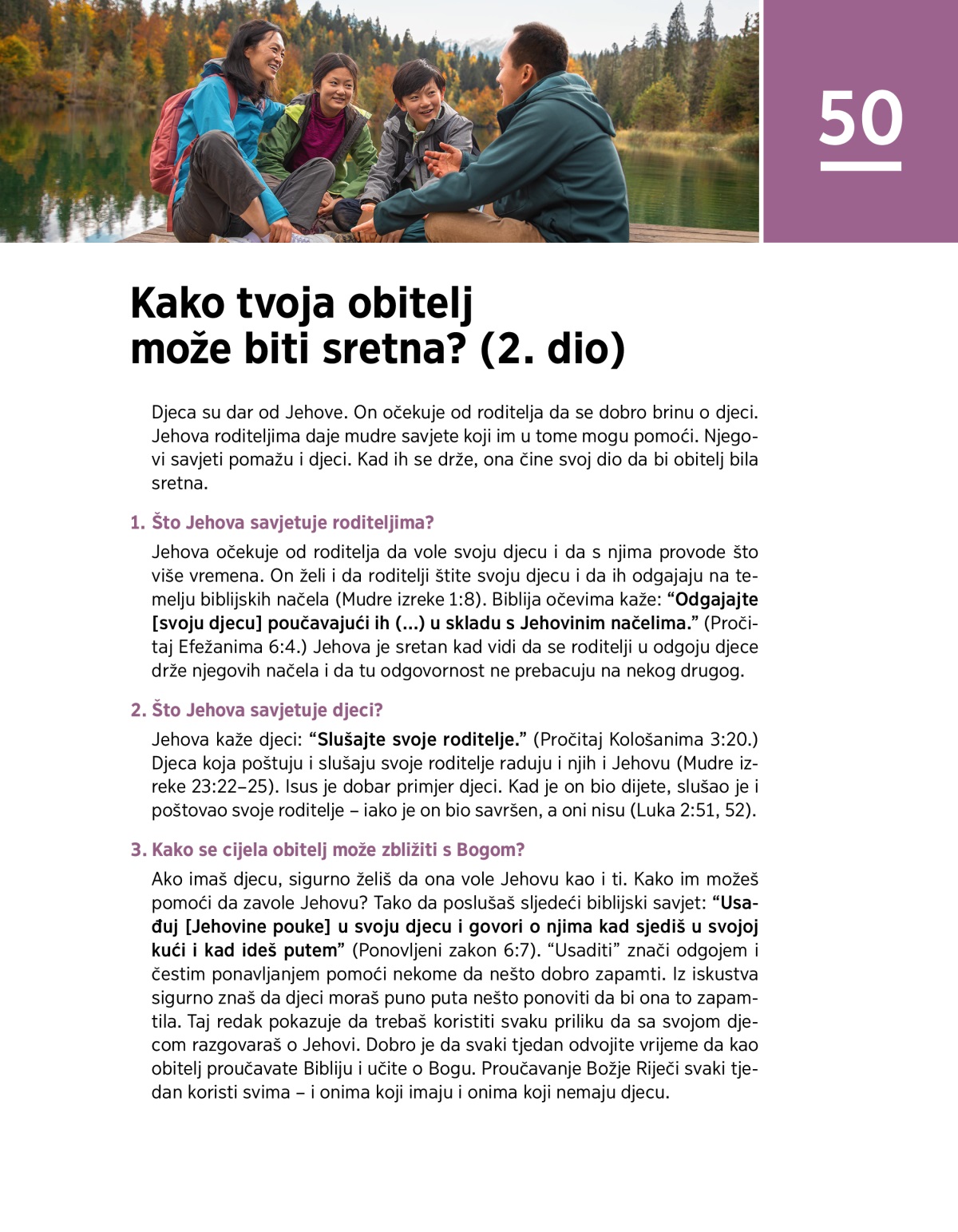 Ako imaš djecu, sigurno želiš da ona vole Jehovu kao i ti. Kako im možeš pomoći da zavole Jehovu? Tako da poslušaš sljedeći biblijski savjet: “Usađuj [Jehovine pouke] u svoju djecu i govori o njima kad sjediš u svojoj kući i kad ideš putem” (Ponovljeni zakon 6:7). “Usaditi” znači odgojem i čestim ponavljanjem pomoći nekome da nešto dobro zapamti. Iz iskustva sigurno znaš da djeci moraš puno puta nešto ponoviti da bi ona to zapamtila. Taj redak pokazuje da trebaš koristiti svaku priliku da sa svojom djecom razgovaraš o Jehovi. Dobro je da svaki tjedan odvojite vrijeme da kao obitelj proučavate Bibliju i učite o Bogu. Proučavanje Božje Riječi svaki tjedan koristi svima – i onima koji imaju i onima koji nemaju djecu.