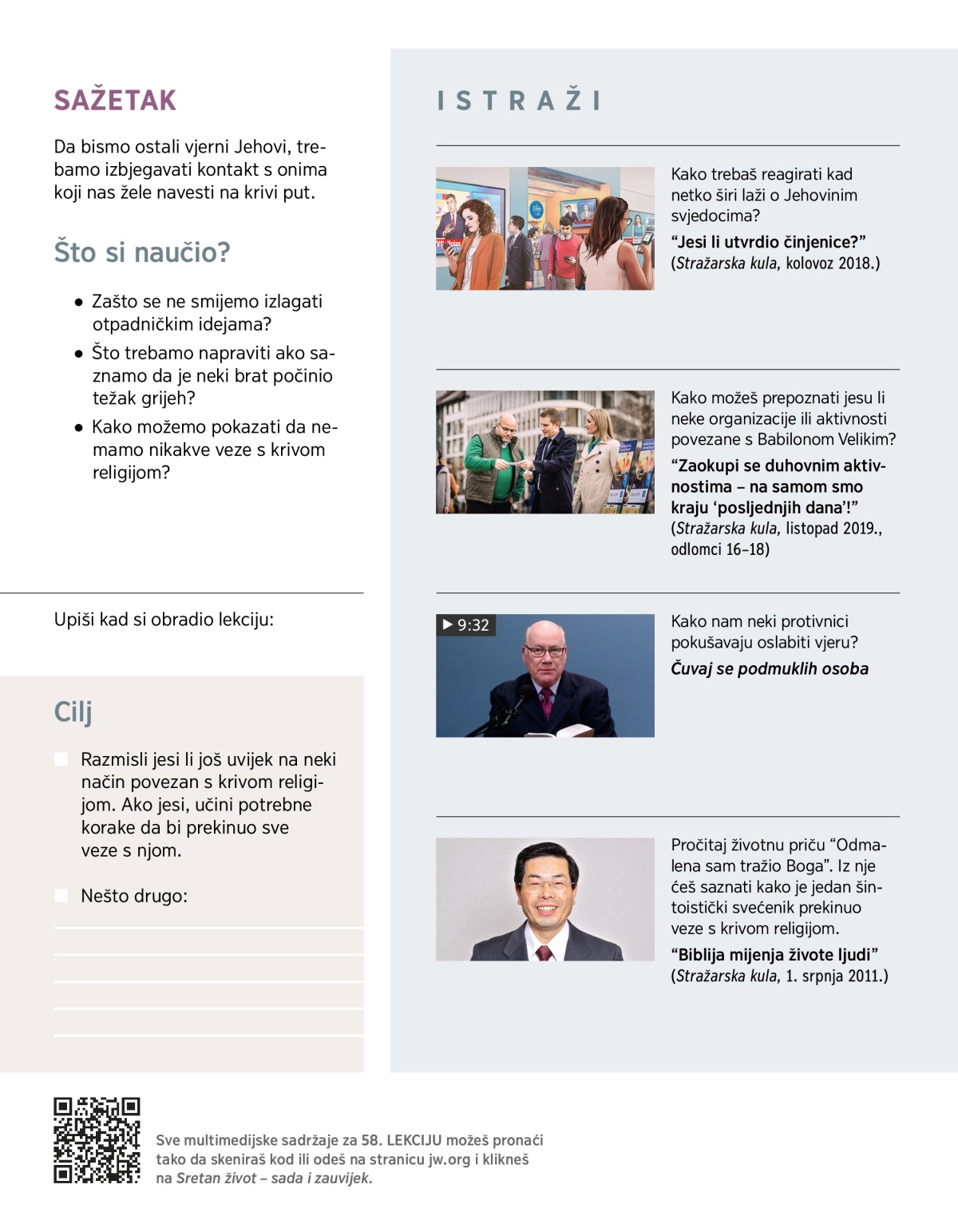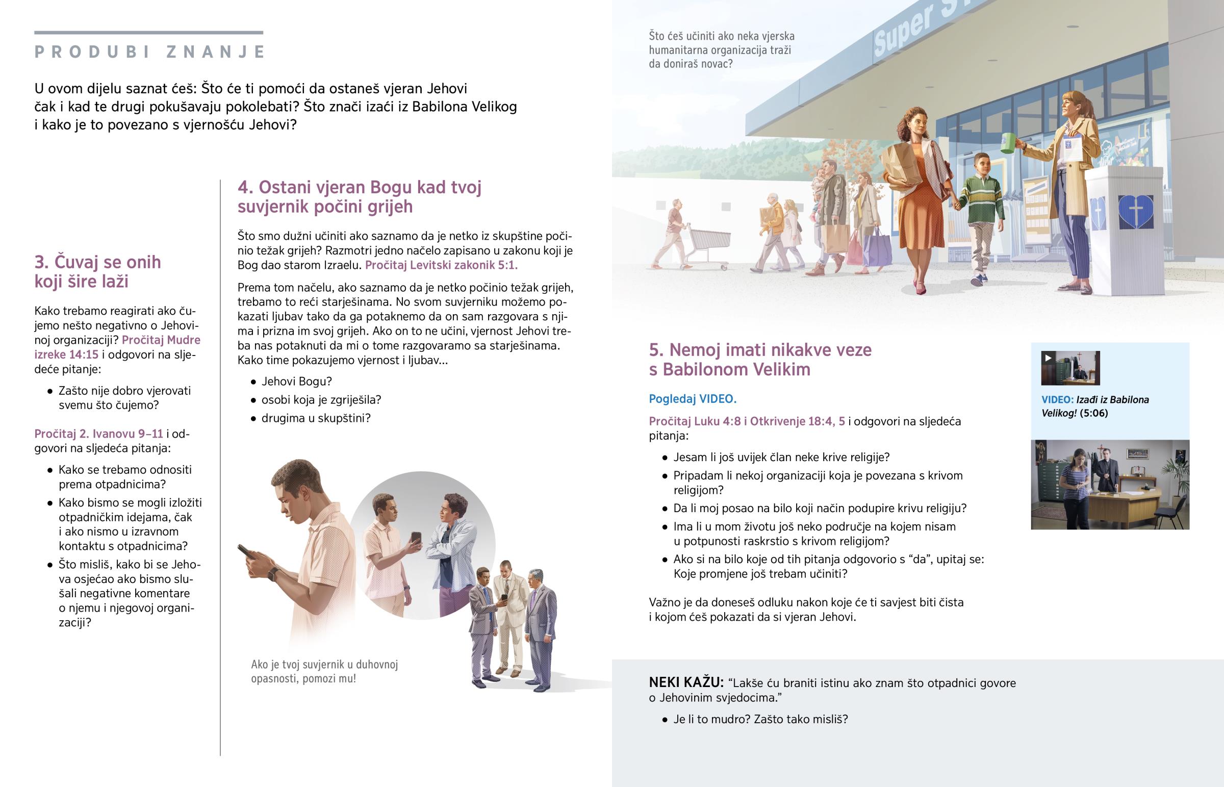 U ovom dijelu saznat ćeš: Što će ti pomoći da ostaneš vjeran Jehovi čak i kad te drugi pokušavaju pokolebati? Što znači izaći iz Babilona Velikog i kako je to povezano s vjernošću Jehovi?