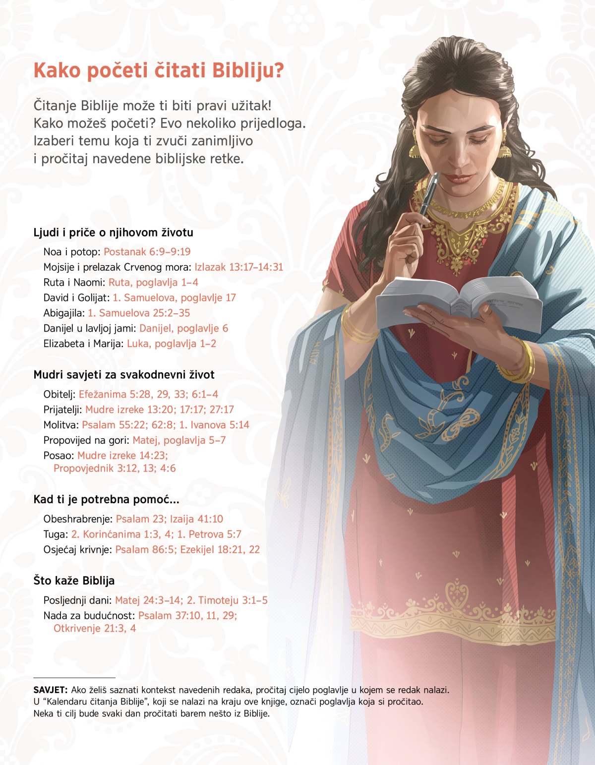 SAVJET: Ako želiš saznati kontekst navedenih redaka, pročitaj cijelo poglavlje u kojem se redak nalazi. U “Kalendaru čitanja Biblije”, koji se nalazi na kraju ove knjige, označi poglavlja koja si pročitao. Neka ti cilj bude svaki dan pročitati barem nešto iz Biblije.