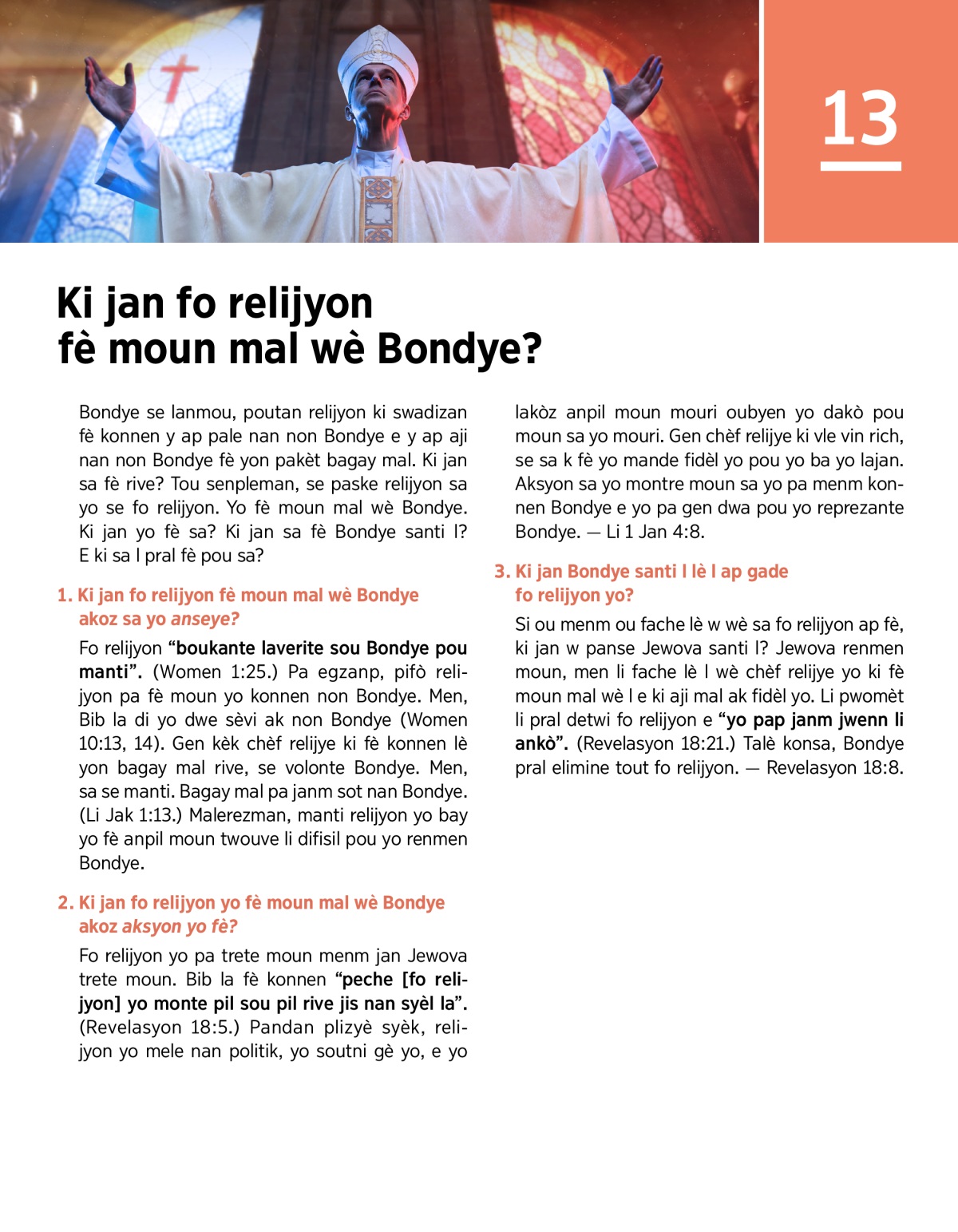 Aprann plis sou fason Bondye wè fo relijyon. Aprann plis sou sa fo relijyon fè, e aprann poukisa sa pa dwe fè w sispann aprann konnen Jewova.