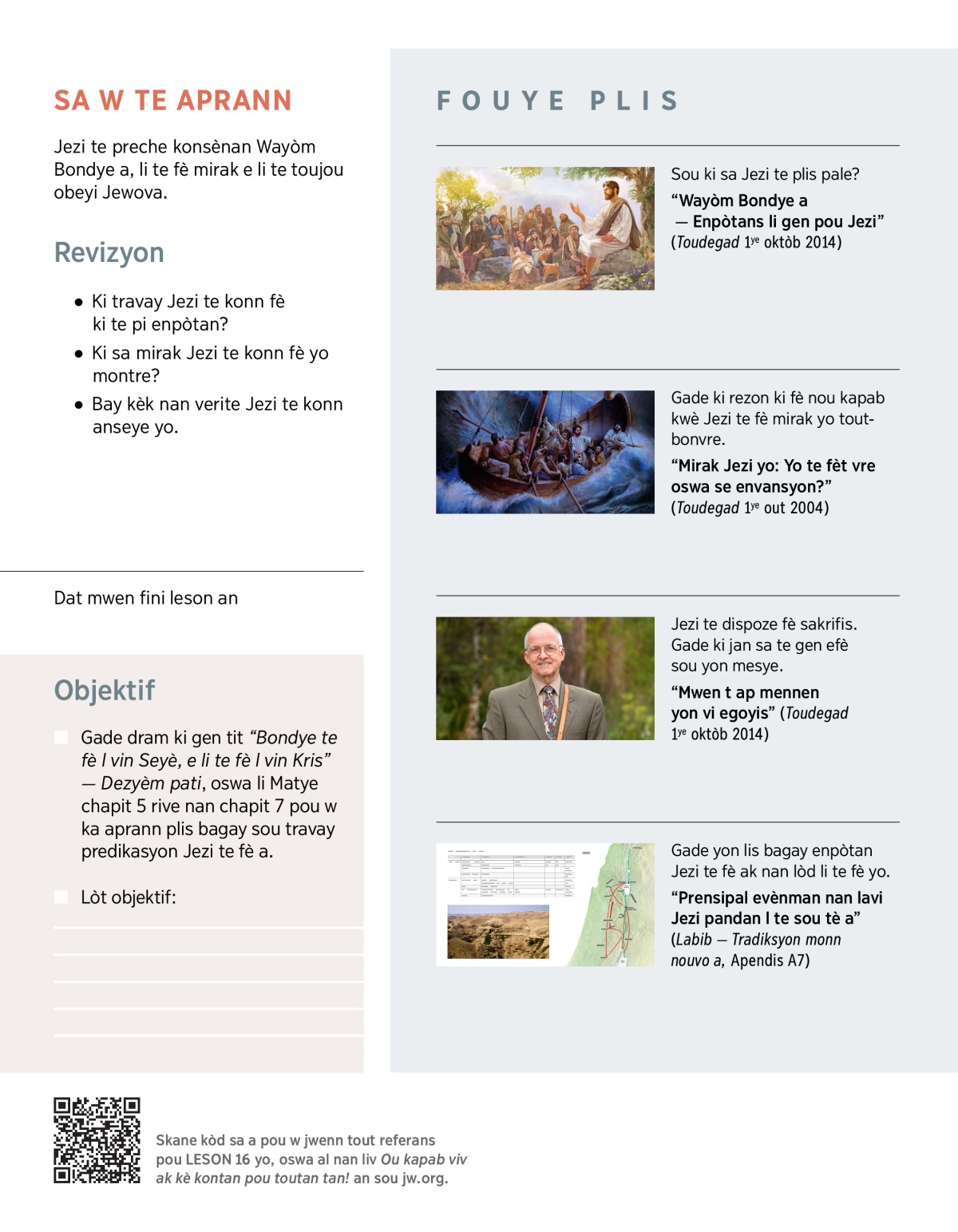 Sa k vin nan tèt anpil moun lè y ap panse ak Jezi se yon tibebe ki san defans, oubyen yon pwofèt ki gen anpil sajès, oubyen yon mesye ki prèske mouri. Men, èske nou pa ka aprann plis bagay sou Jezi lè nou egzamine fason li te viv sou tè a? Nan leson sa a, nou pral egzamine kèk nan bagay ki pi enpòtan Jezi te fè ak fason sa kapab ede w.