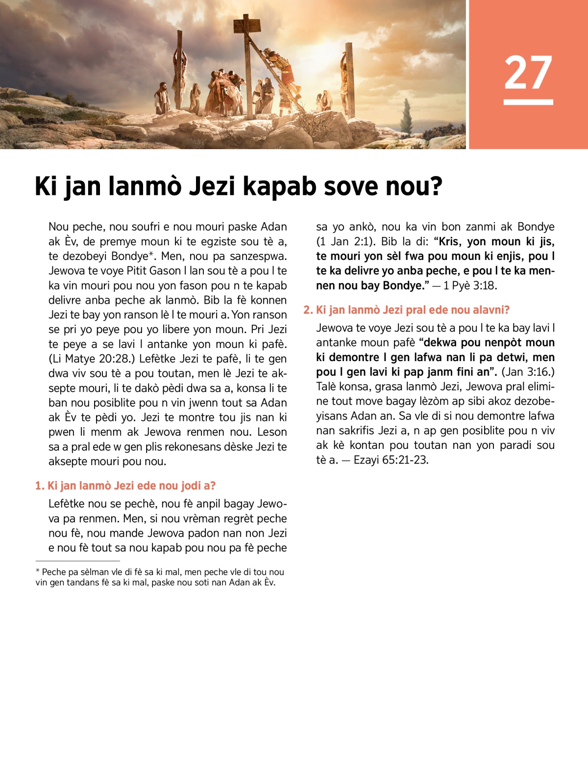 Nou peche, nou soufri e nou mouri paske Adan ak Èv, de premye moun ki te egziste sou tè a, te dezobeyi Bondyea. Men, nou pa sanzespwa. Jewova te voye Pitit Gason l lan sou tè a pou l te ka vin mouri pou nou yon fason pou n te kapab delivre anba peche ak lanmò. Bib la fè konnen Jezi te bay yon ranson lè l te mouri a. Yon ranson se pri yo peye pou yo libere yon moun. Pri Jezi te peye a se lavi l antanke yon moun ki pafè. (Li Matye 20:28.) Lefètke Jezi te pafè, li te gen dwa viv sou tè a pou toutan, men lè Jezi te aksepte mouri, li te dakò pèdi dwa sa a, konsa li te ban nou posiblite pou n vin jwenn tout sa Adan ak Èv te pèdi yo. Jezi te montre tou jis nan ki pwen li menm ak Jewova renmen nou. Leson sa a pral ede w gen plis rekonesans dèske Jezi te aksepte mouri pou nou.