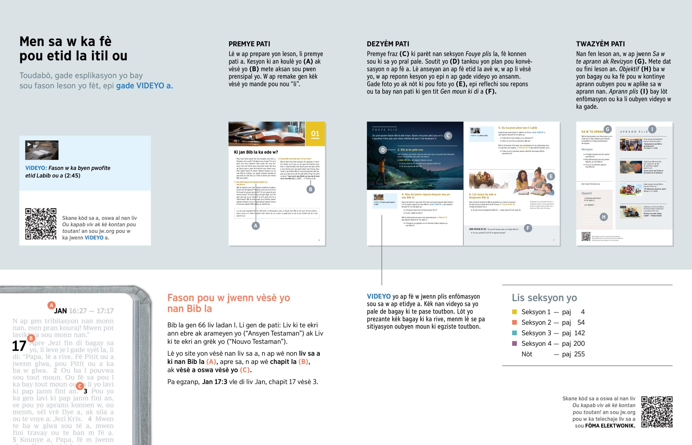 Lè w ap prepare yon leson, li premye pati a. Kesyon ki an koulè yo (A) ak vèsè yo (B) mete aksan sou pwen prensipal yo. W ap remake gen kèk vèsè yo mande pou nou “li”.