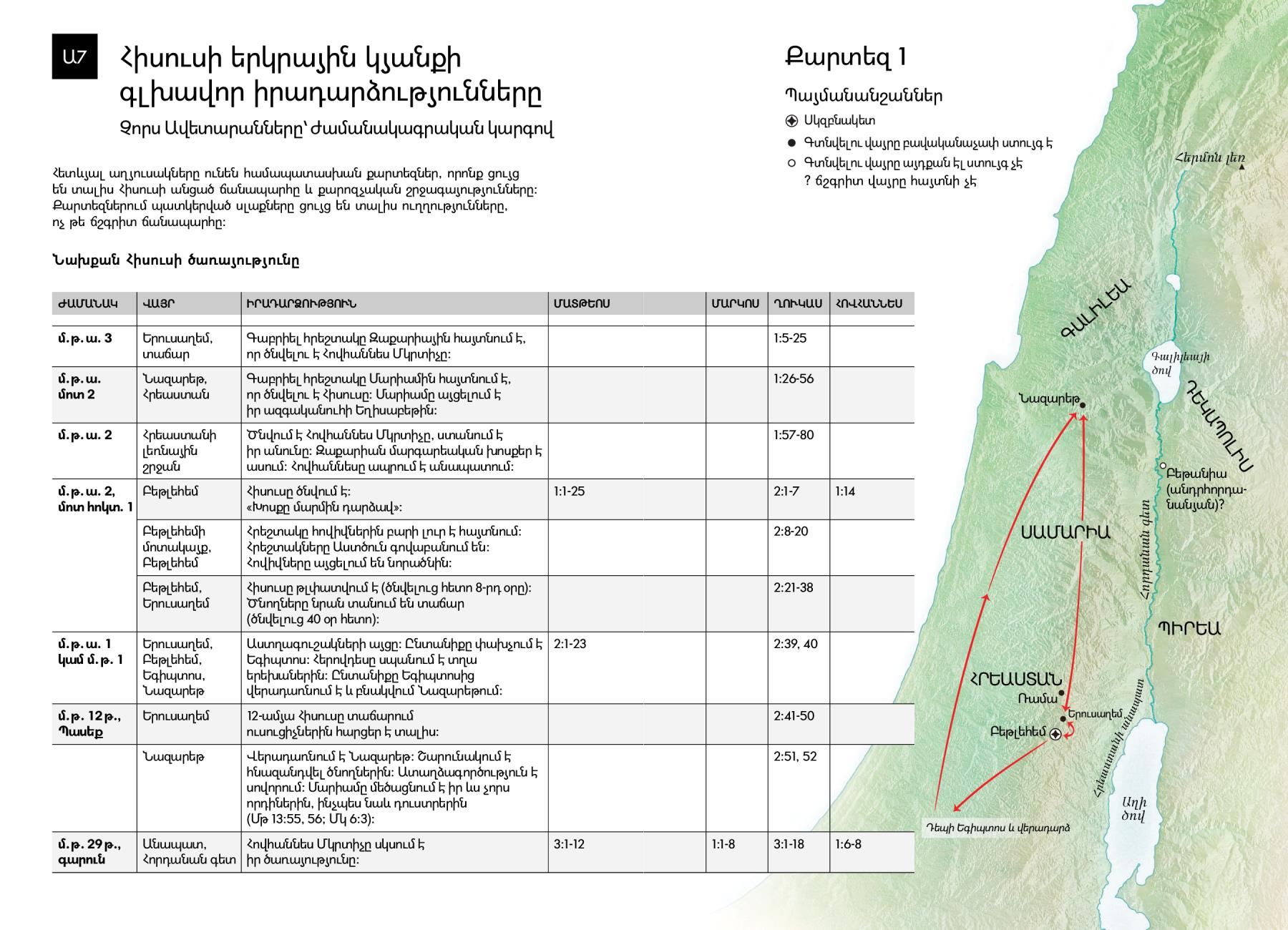 Հետևյալ աղյուսակները ունեն համապատասխան քարտեզներ, որոնք ցույց են տալիս Հիսուսի անցած ճանապարհը և քարոզչական շրջագայությունները: Քարտեզներում պատկերված սլաքները ցույց են տալիս ուղղությունները, ոչ թե ճշգրիտ ճանապարհը: