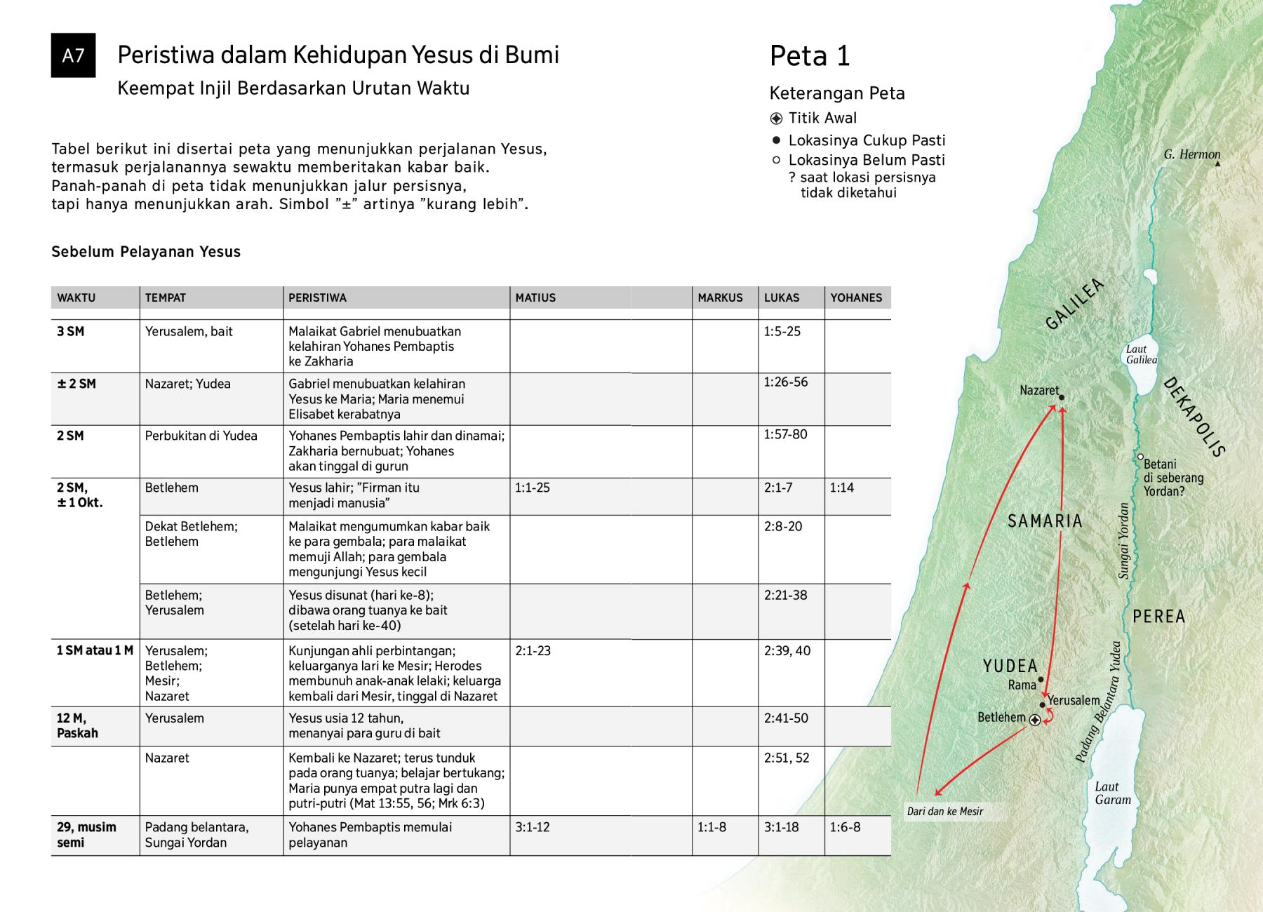 Tabel berikut ini disertai peta yang menunjukkan perjalanan Yesus, termasuk perjalanannya sewaktu memberitakan kabar baik. Panah-panah di peta tidak menunjukkan jalur persisnya, tapi hanya menunjukkan arah. Simbol ”±” artinya ”kurang lebih”.