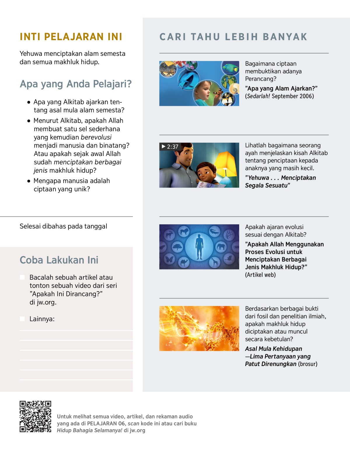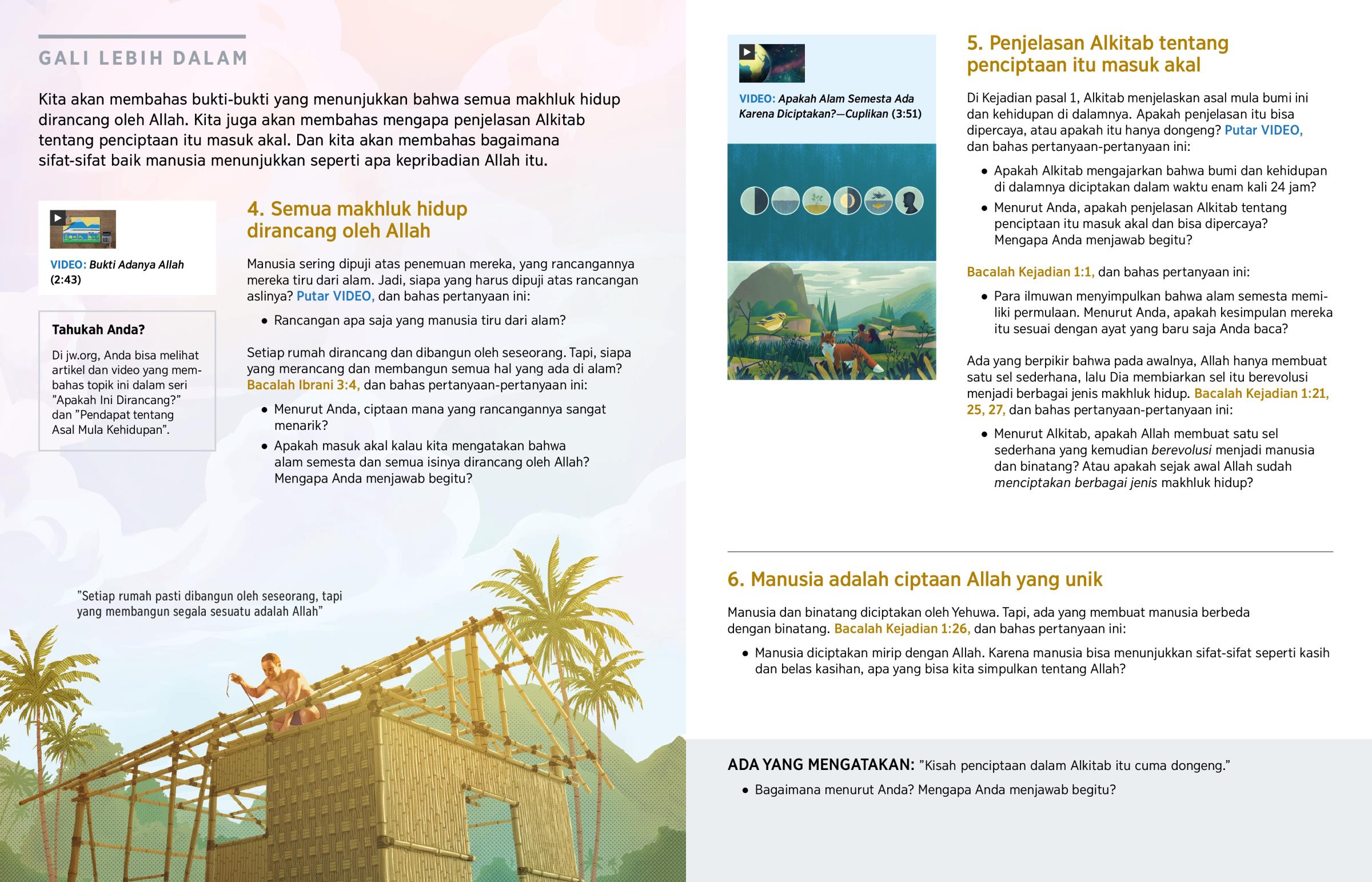 Kita akan membahas bukti-bukti yang menunjukkan bahwa semua makhluk hidup dirancang oleh Allah. Kita juga akan membahas mengapa penjelasan Alkitab tentang penciptaan itu masuk akal. Dan kita akan membahas bagaimana sifat-sifat baik manusia menunjukkan seperti apa kepribadian Allah itu.