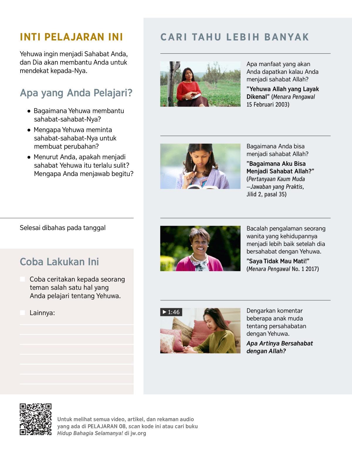 Yehuwa ingin Anda lebih mengenal Dia. Mengapa? Karena Dia ingin Anda bersahabat dengan-Nya. Dia berharap kalau Anda belajar lebih banyak tentang sifat-sifat-Nya, kehendak-Nya, dan cara Dia memperlakukan manusia, Anda akan semakin ingin menjadi sahabat-Nya. Tapi, apakah kita memang bisa menjadi sahabat Allah? (Baca Mazmur 25:14.) Apa yang perlu kita lakukan untuk menjadi sahabat Allah? Alkitab menjawab pertanyaan-pertanyaan itu. Alkitab juga memberitahukan mengapa Yehuwa adalah Sahabat yang terbaik.