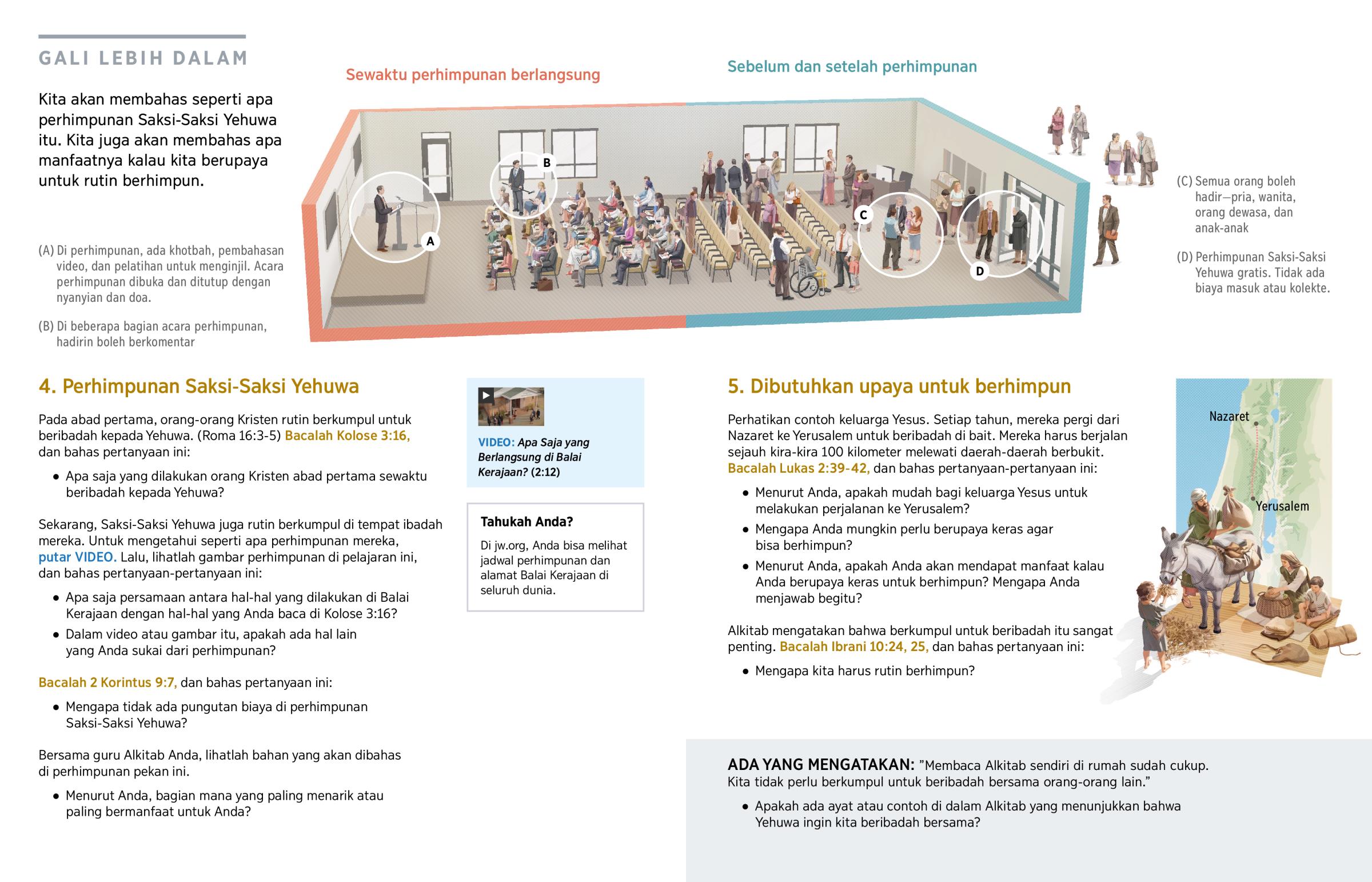 Sekarang, Saksi-Saksi Yehuwa juga rutin berkumpul di tempat ibadah mereka. Untuk mengetahui seperti apa perhimpunan mereka, putar VIDEO. Lalu, lihatlah gambar perhimpunan di pelajaran ini, dan bahas pertanyaan-pertanyaan ini: