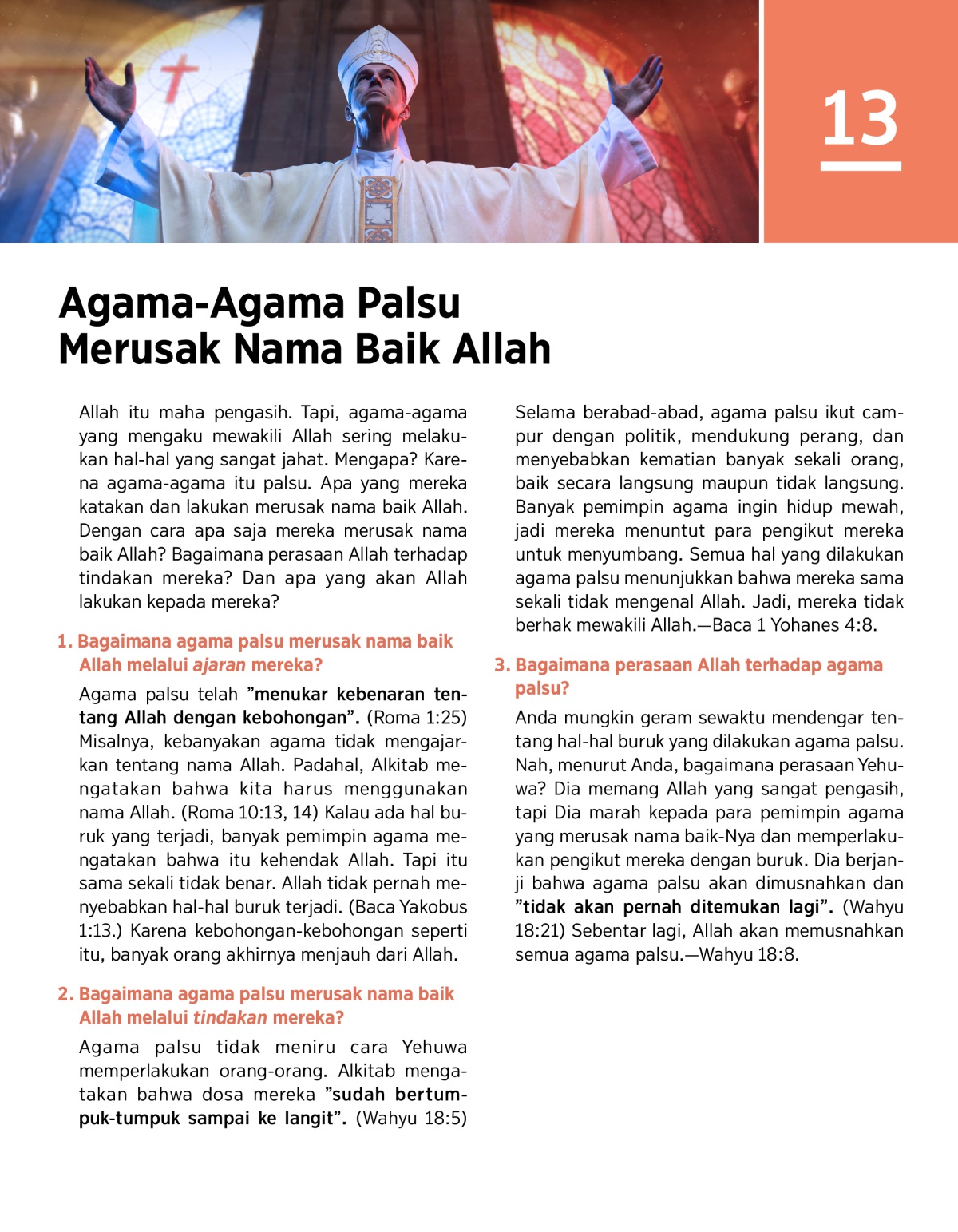Agama palsu telah melakukan berbagai hal yang merusak nama baik Allah. Salah satu yang paling parah adalah keterlibatan mereka dalam perang. Untuk melihat contohnya, putar VIDEO, dan bahas pertanyaan-pertanyaan ini: